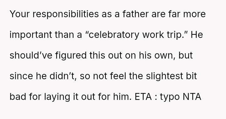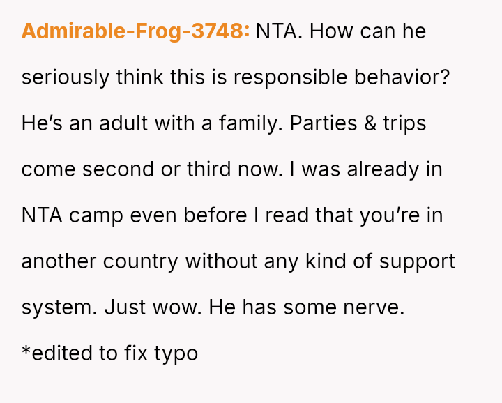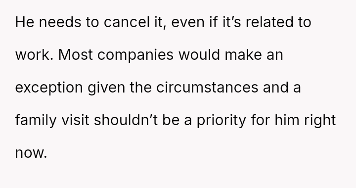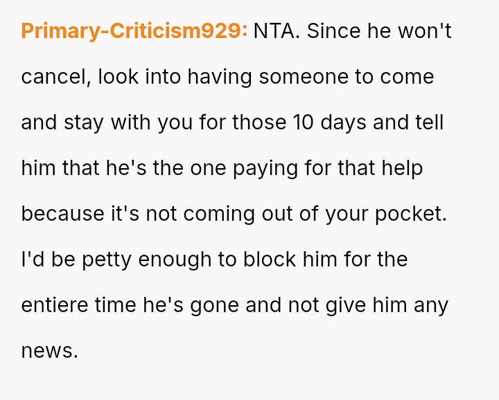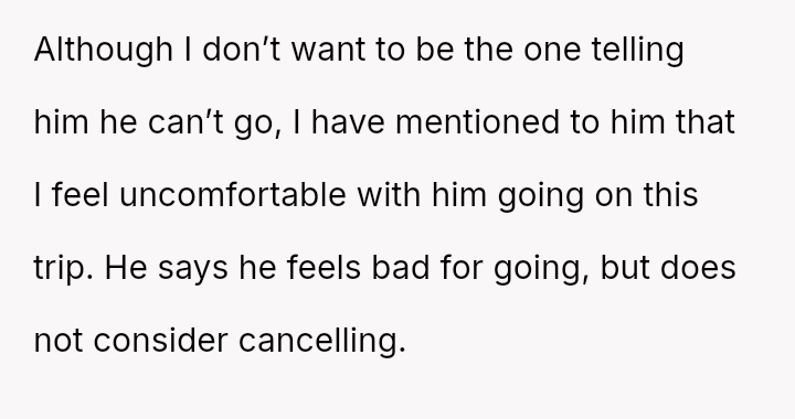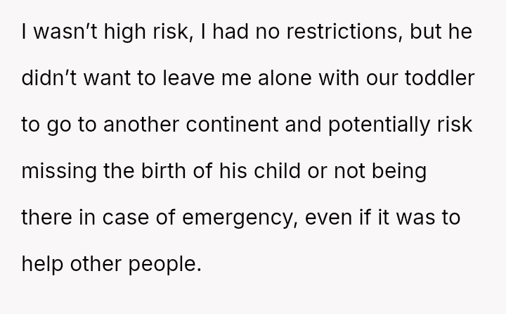 Conversely, is the husband demonstrating a lack of responsibility by insisting on traveling internationally for a non-essential event when his wife is medically vulnerable and unsupported?