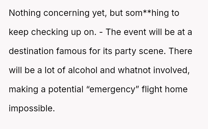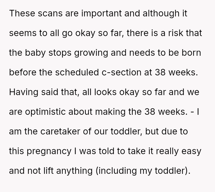 Her discomfort stems from serious medical concerns, the lack of local support for her toddler, and the emotionally charged timing of the travel coinciding with the anniversary of their first child's difficult birth.