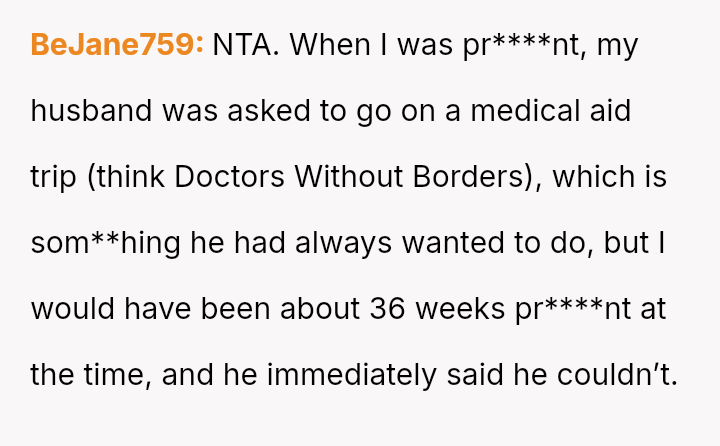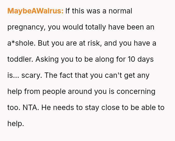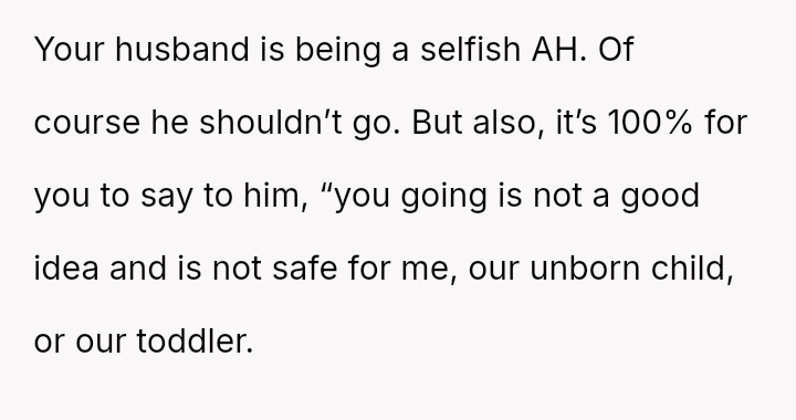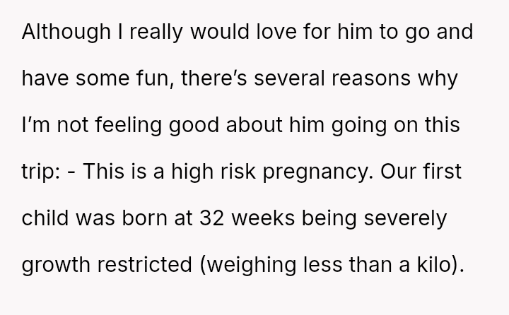Is the OP being unreasonable by prioritizing her immediate, high-risk physical and emotional needs over her husband's desire to take this specific trip?