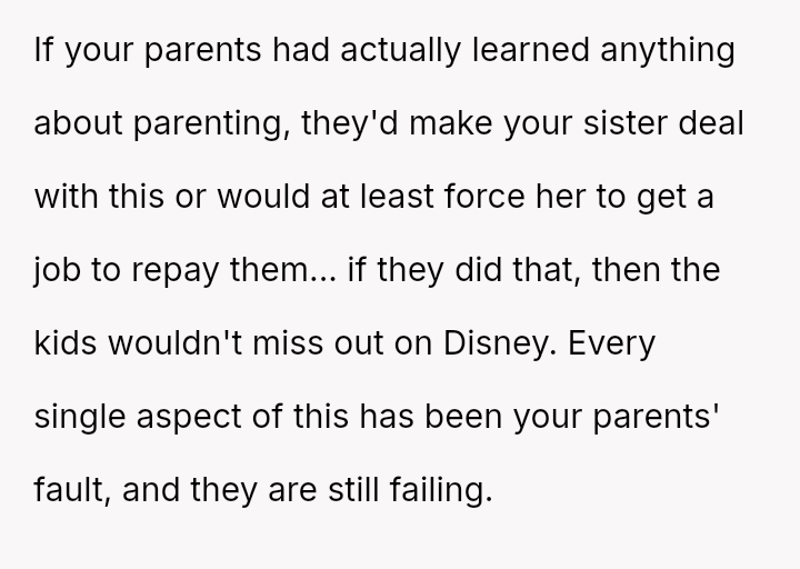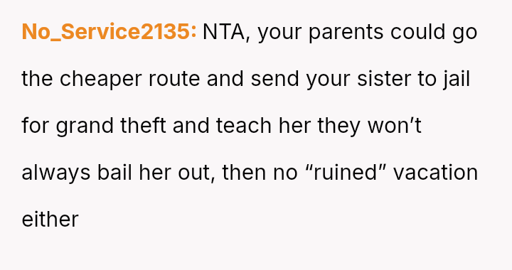 The central conflict lies between the OP's reasonable demand for accountability (insisting on honesty during the insurance claim or facing legal consequences) and her parents' efforts to shield her sister and preserve family harmony, which ultimately cost the OP a planned family vacation.