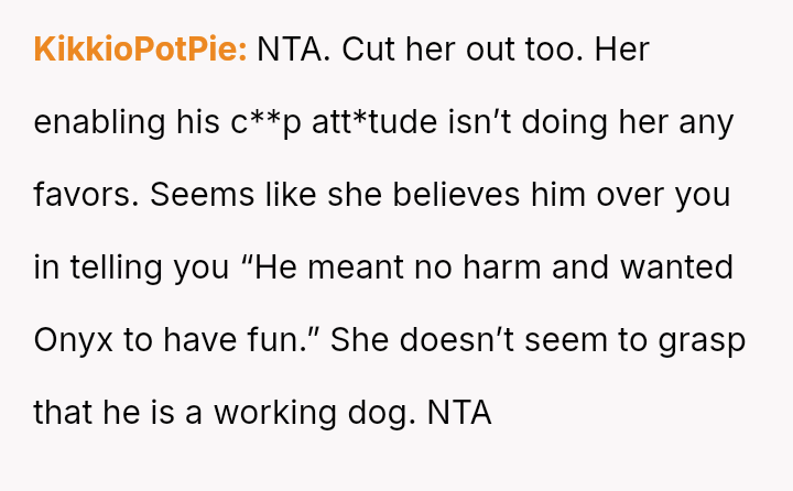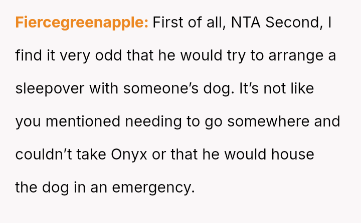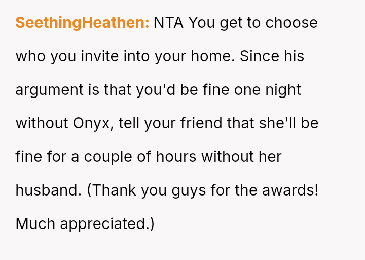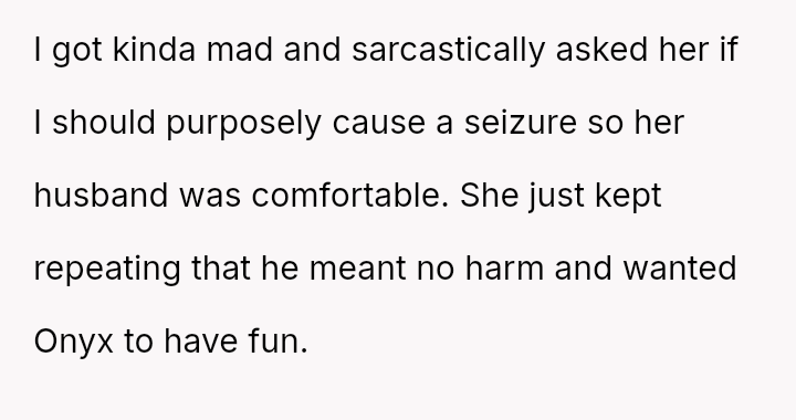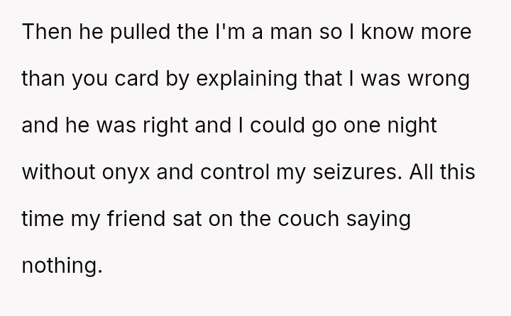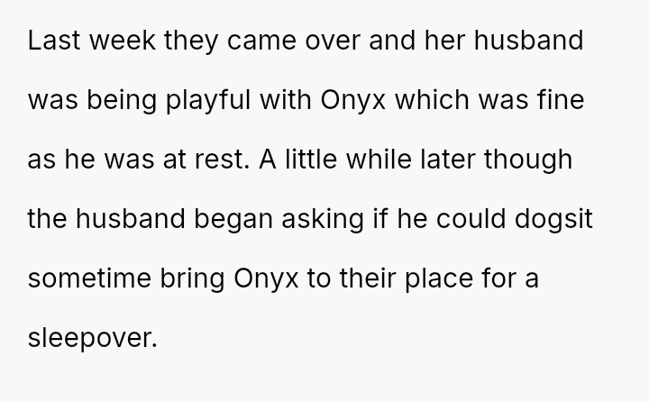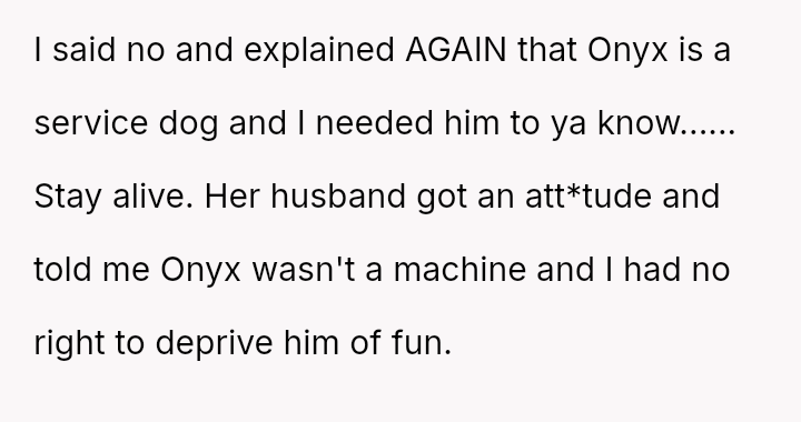 The original poster (OP) is facing a significant conflict rooted in defending the necessary boundaries surrounding their service animal, Onyx, against a friend and her husband who dismiss the OP's medical needs.