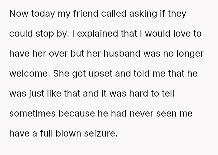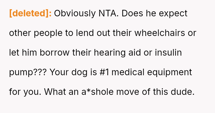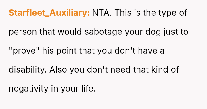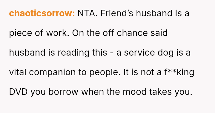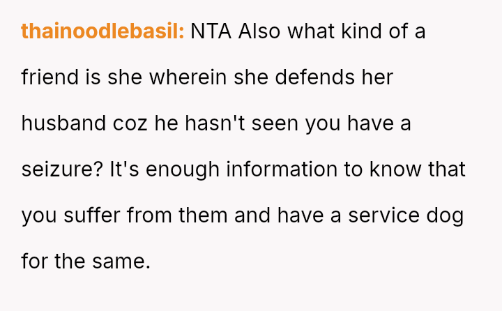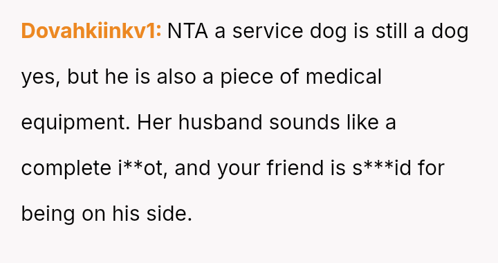 The OP acted to protect their safety by banning the husband after he aggressively disregarded the dog's working role and questioned the OP's disability, while the friend remained pa*sive during the initial confrontation.