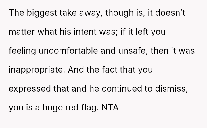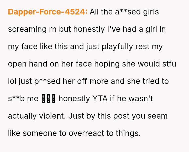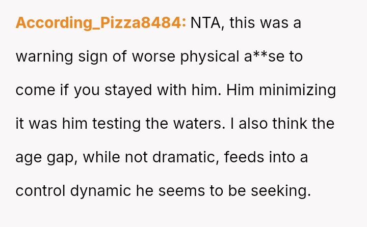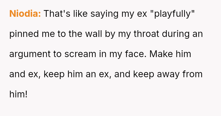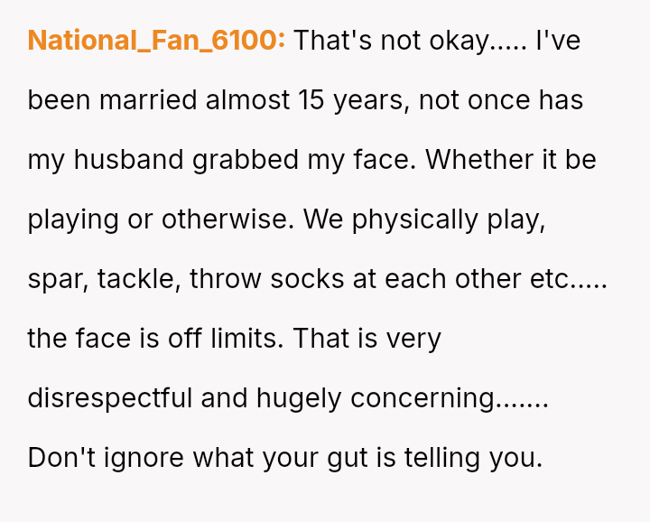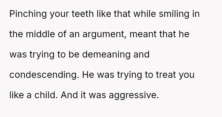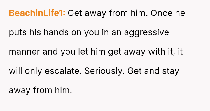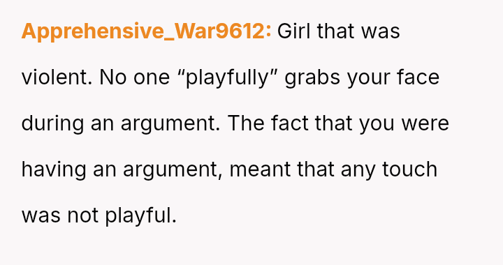 The central conflict lies between the OP's boundary setting—stating that the physical action felt controlling and frightening—and her partner's complete dismissal of her reaction as an overreaction to a "playful little grab" or "love tap." Was the OP right to cla*sify the partner's aggressive, smiling physical restraint during an argument as a sign of violence and immediately leave, or did she misinterpret a misguided attempt at de-escalation?