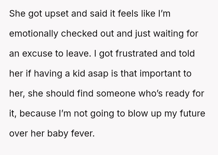 Katie, however, experiences his firm stance as a sign that he is emotionally distant and unwilling to meet her timeline for major life milestones, creating a sharp conflict between his current practical reality and her desire for a shared future.