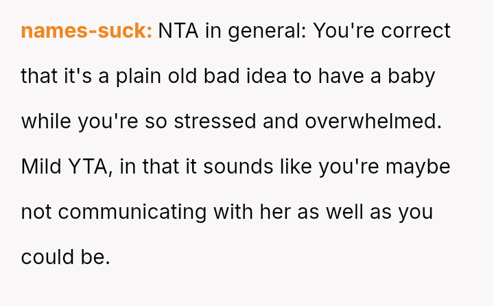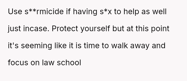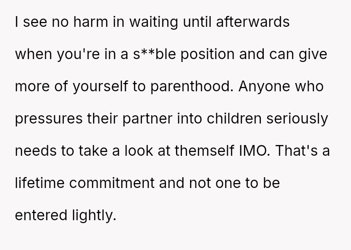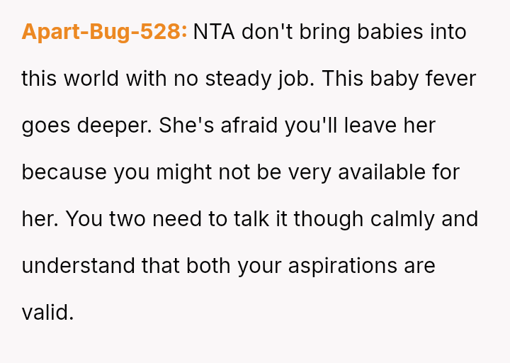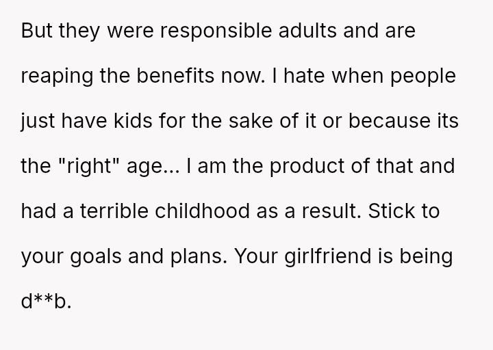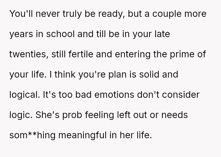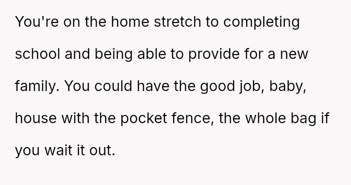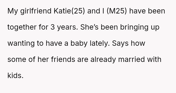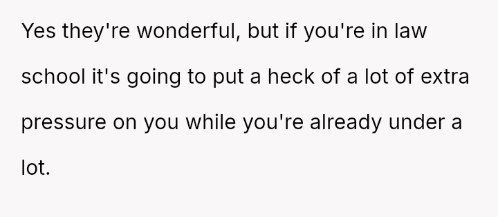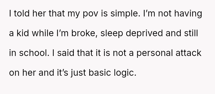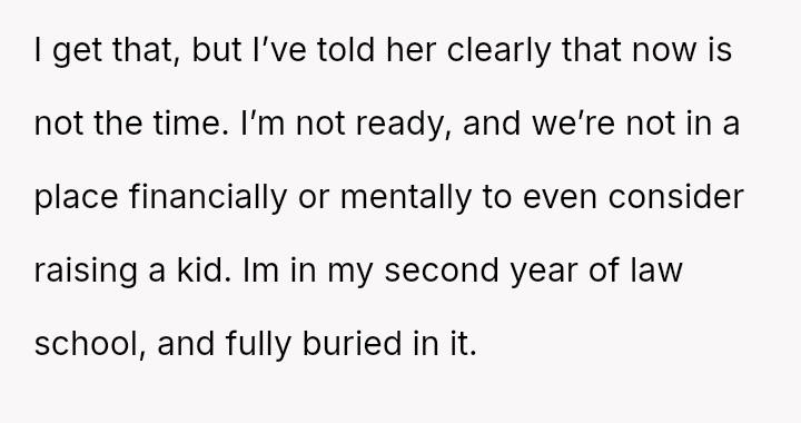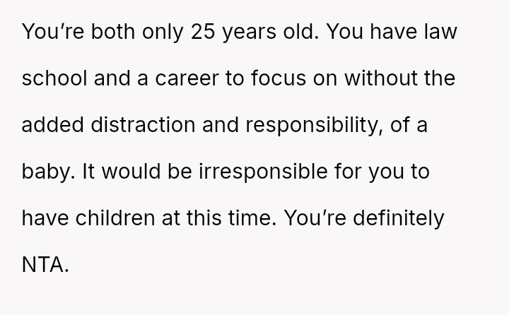 The original poster (OP) is clearly committed to his demanding law school schedule and financial s**bility, viewing his refusal to start a family now as a logical necessity rather than an emotional rejection of his girlfriend, Katie.