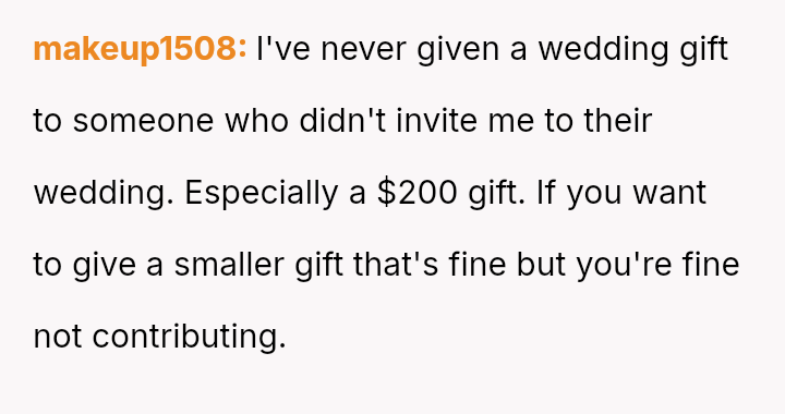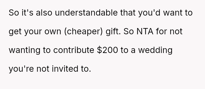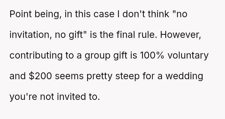 The central question is whether the OP is wrong for refusing to pay the full group contribution ($200) for a wedding they are not attending, especially when the invitation was rescinded under questionable circumstances.