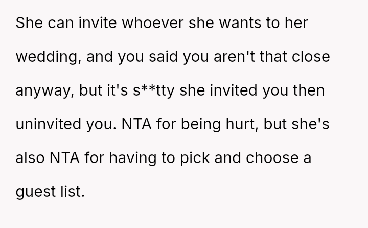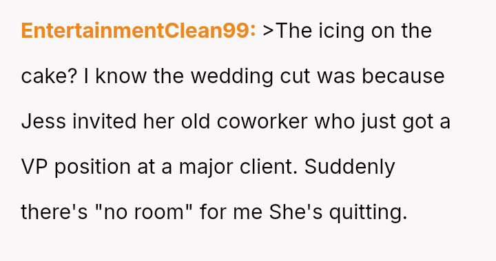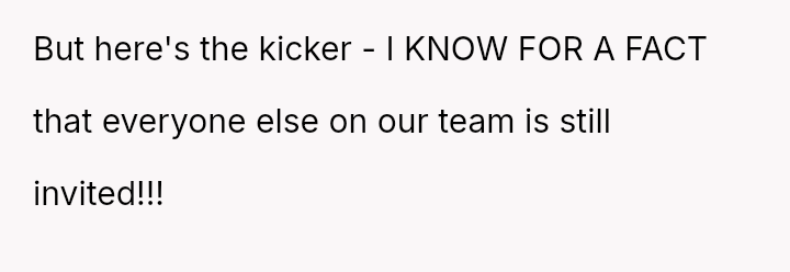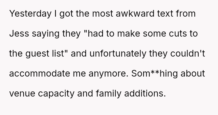However, Jess later informed the OP via text that she had to cut her from the guest list due to venue capacity, yet the OP knows all other team members remain invited.