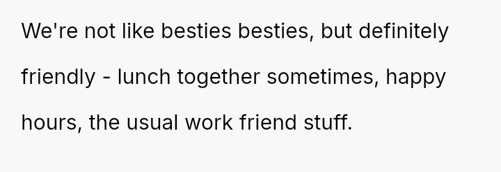 Jess initially invited the entire eight-person team to the wedding, and the team is generally friendly, engaging in typical work social activities.