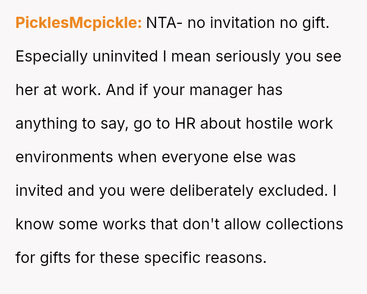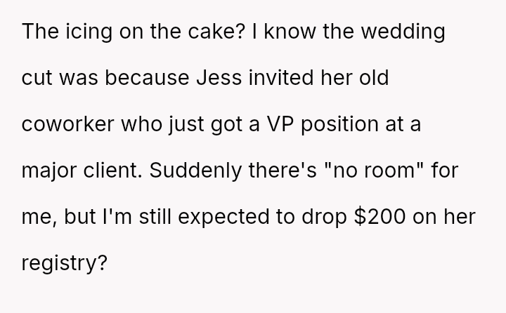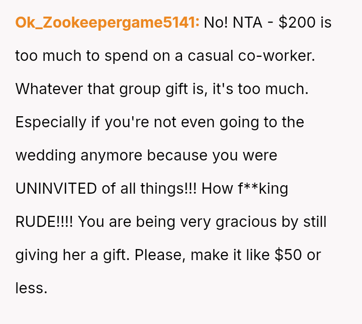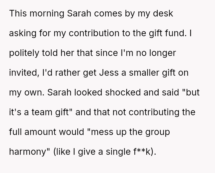 The OP suspects this change is because Jess invited an influential former coworker, leading the OP to question whether they should still contribute the full amount to the group gift when they are uninvited.