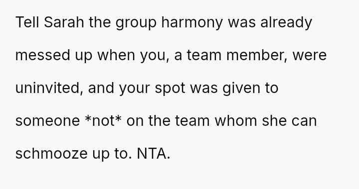 The OP feels slighted by the perceived reason for the uninvitation—prioritizing a high-value professional contact—while still being held to the group's financial standard, creating a dilemma between maintaining superficial workplace harmony and honoring their personal exclusion.