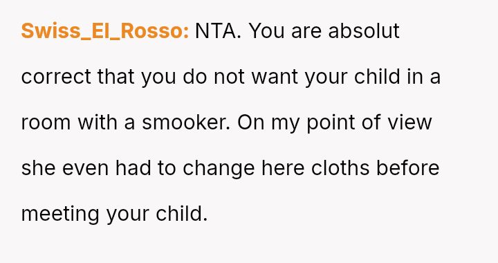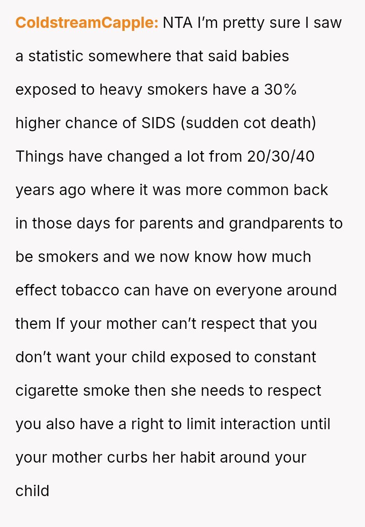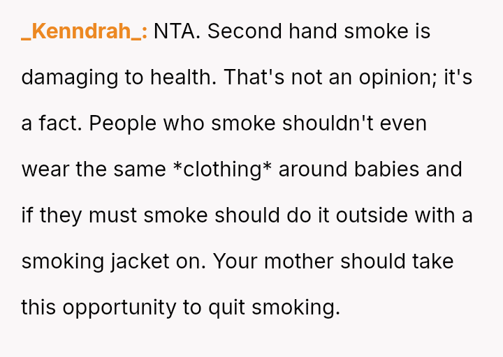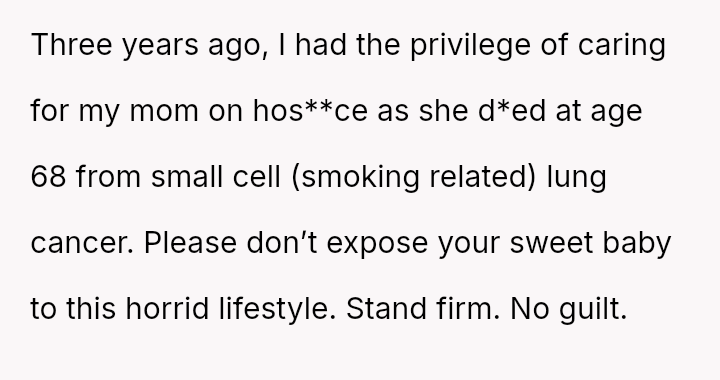 The original poster is facing a difficult conflict between protecting their newborn from secondhand smoke and managing their mother's strong desire to spend time with her new grandchild.