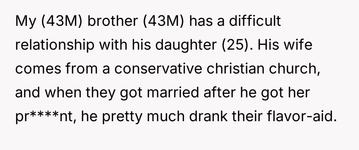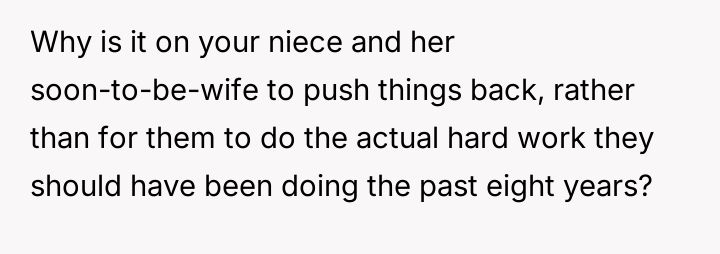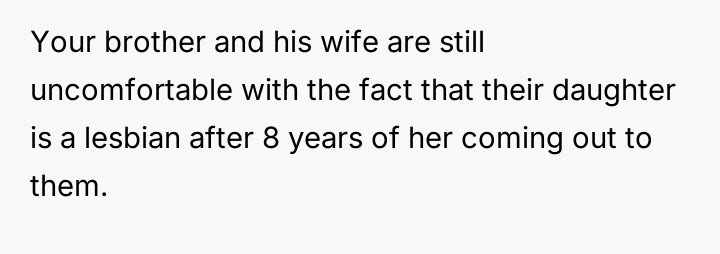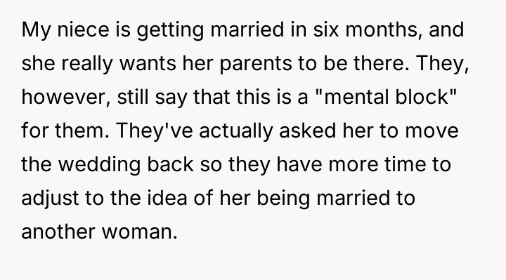 The original poster (OP) is facing significant conflict due to defending their niece against the conditional acceptance shown by the niece's parents regarding her upcoming same-s*x marriage.