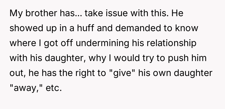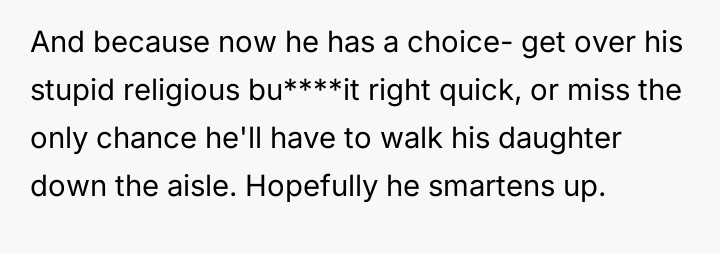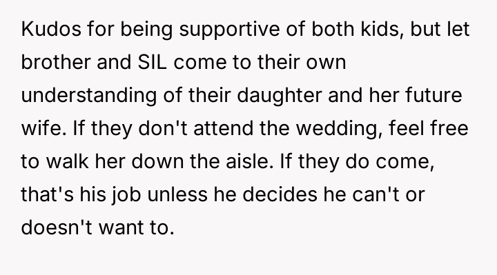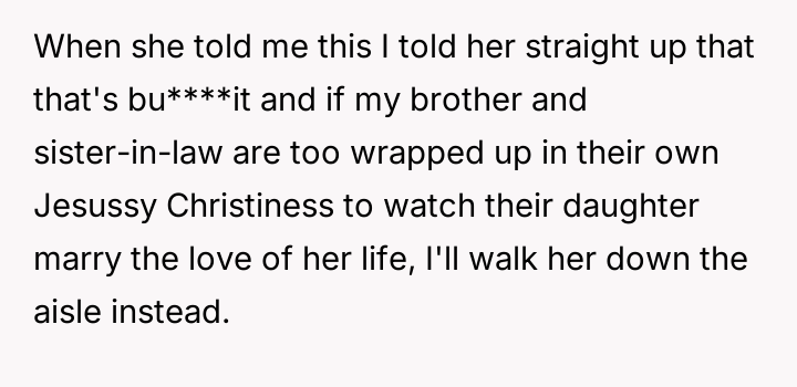 The OP strongly supports their niece, even offering to walk her down the aisle, which directly challenges the brother and sister-in-law who are struggling with their religious beliefs and have asked their daughter to delay her wedding.