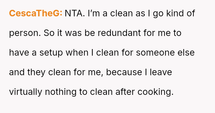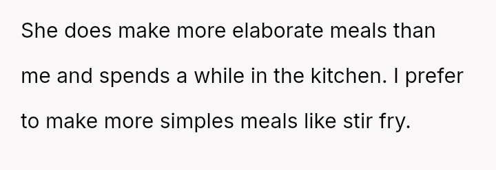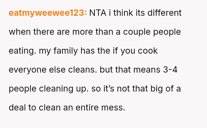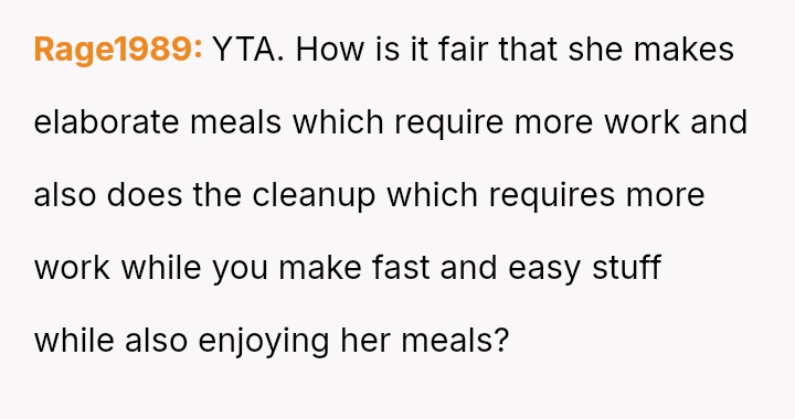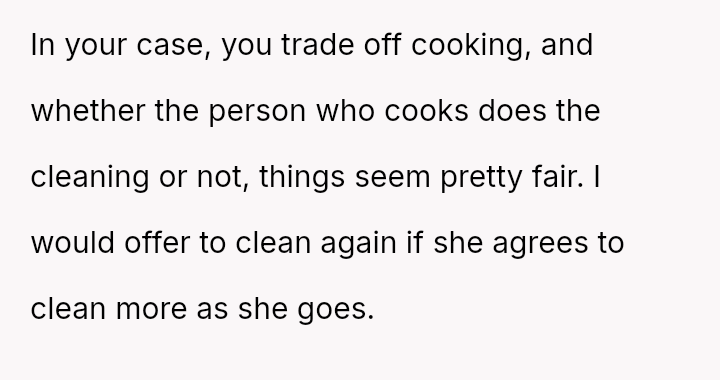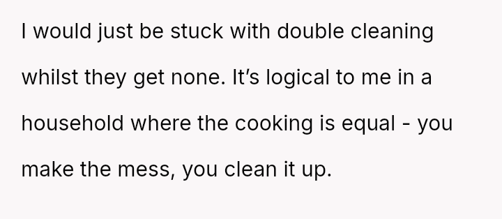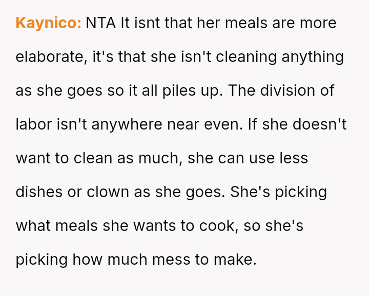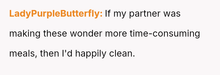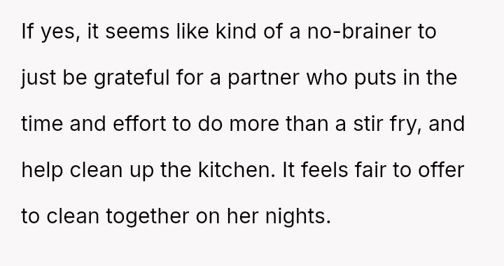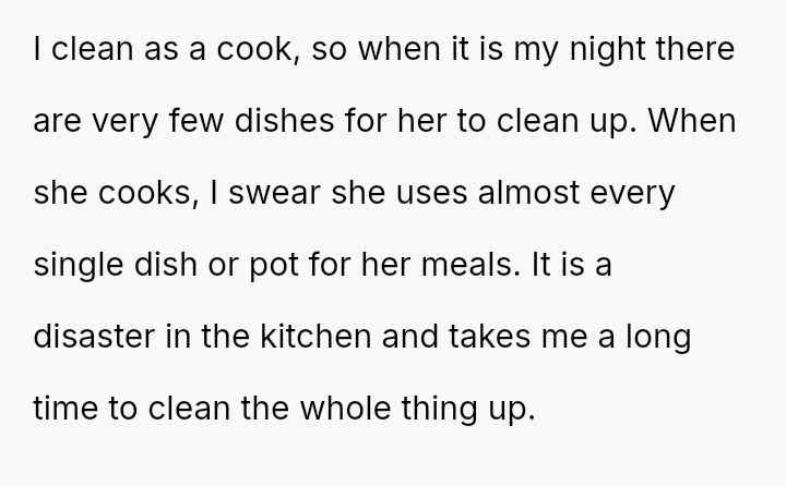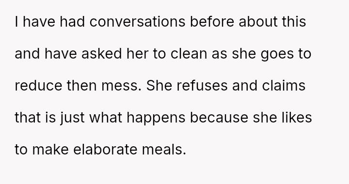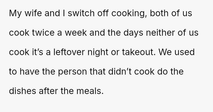 The original poster (OP) has reached a breaking point regarding the unequal division of post-meal cleanup, specifically when his wife cooks elaborate meals that generate significant mess.