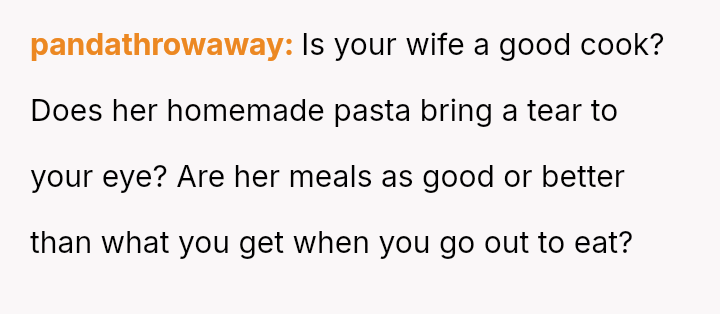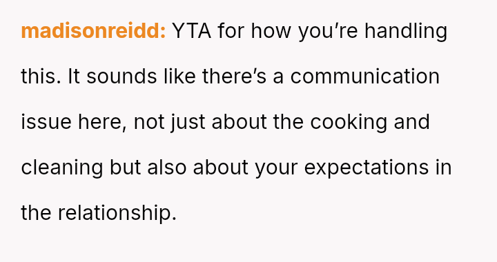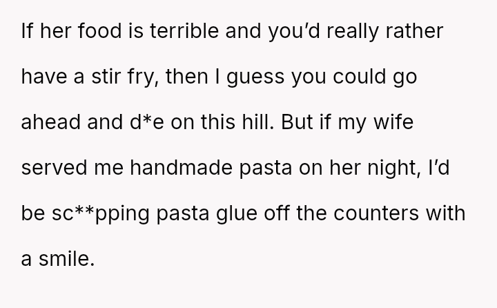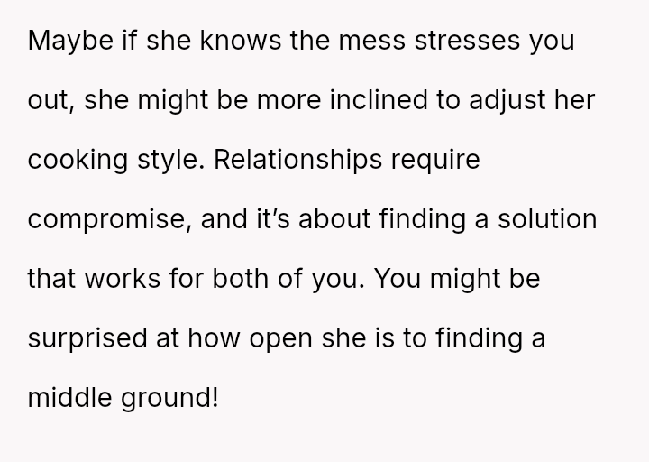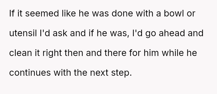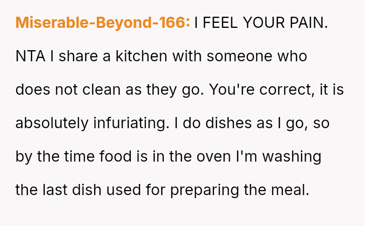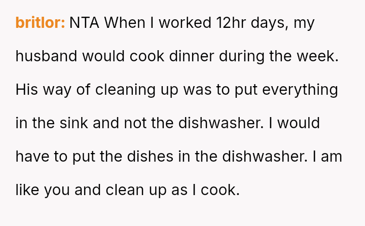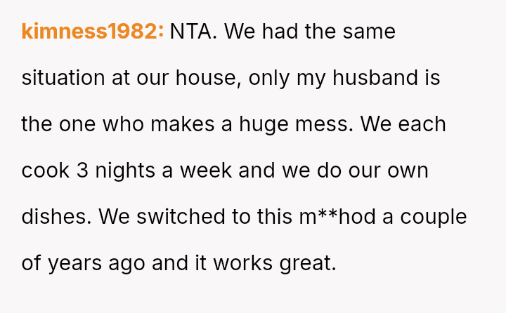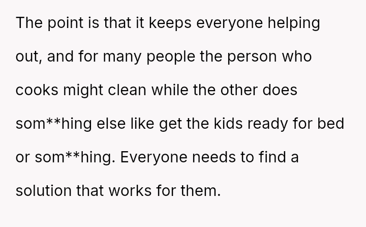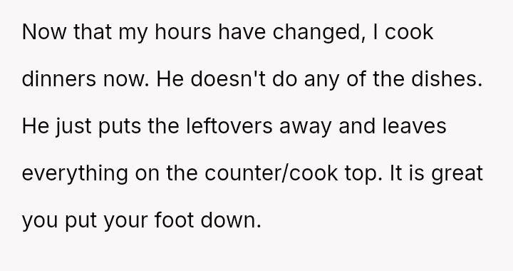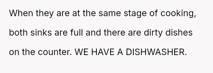 The original poster (OP) has reached a breaking point regarding the unequal division of post-meal cleanup, specifically when his wife cooks elaborate meals that generate significant mess.