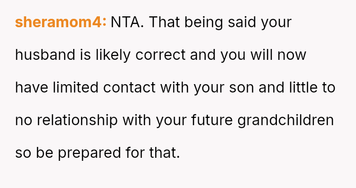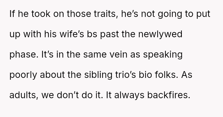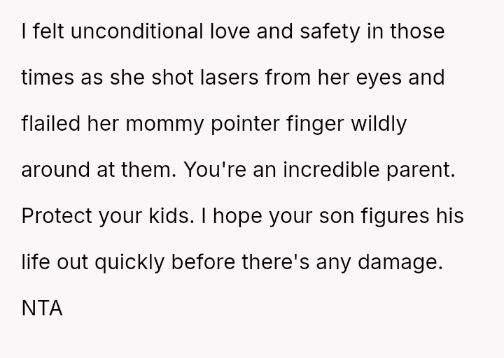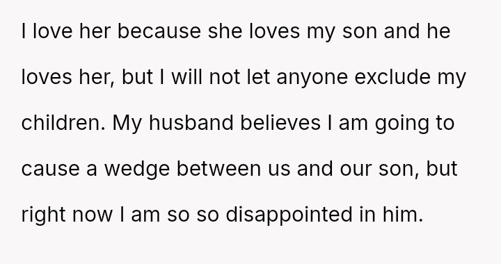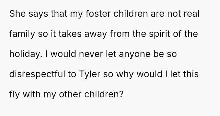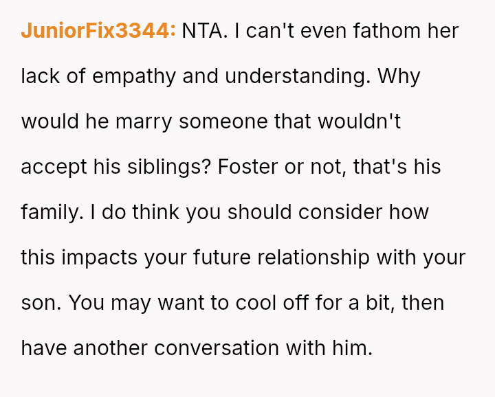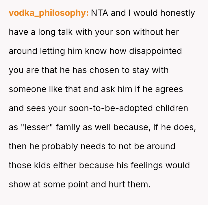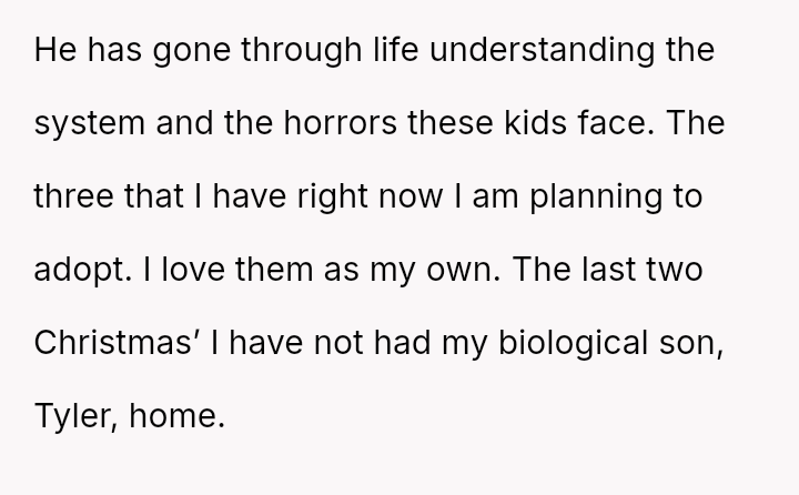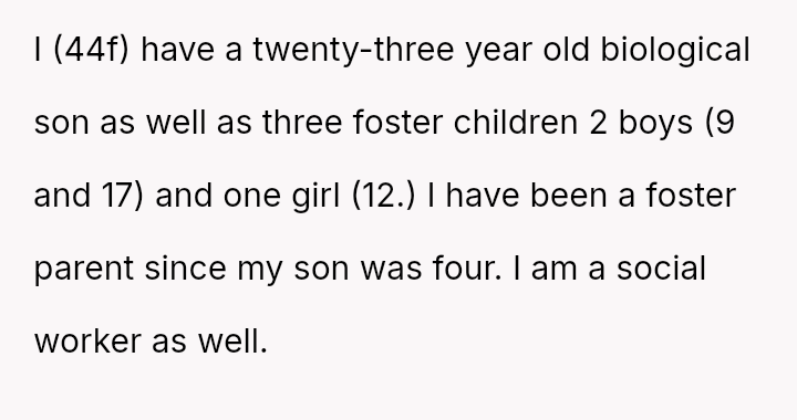 The original poster (OP) is facing a painful conflict where her desire to protect her foster children, whom she views as her true family, clashes directly with her biological son's commitment to his wife's wishes.