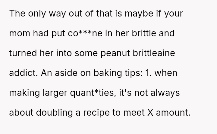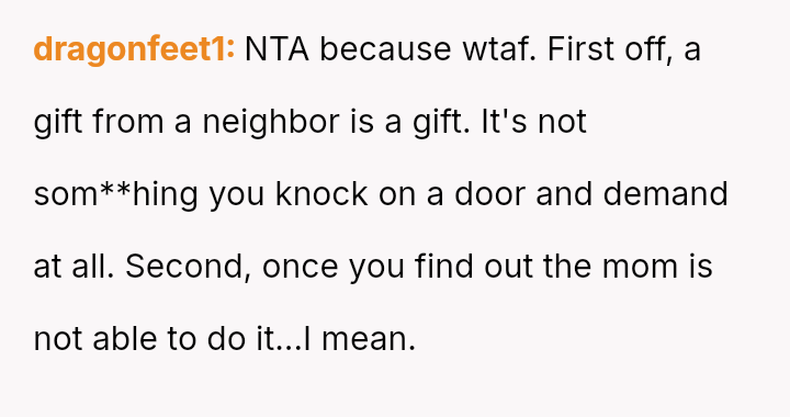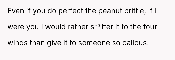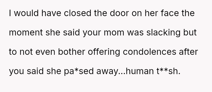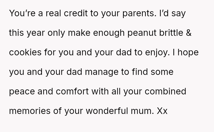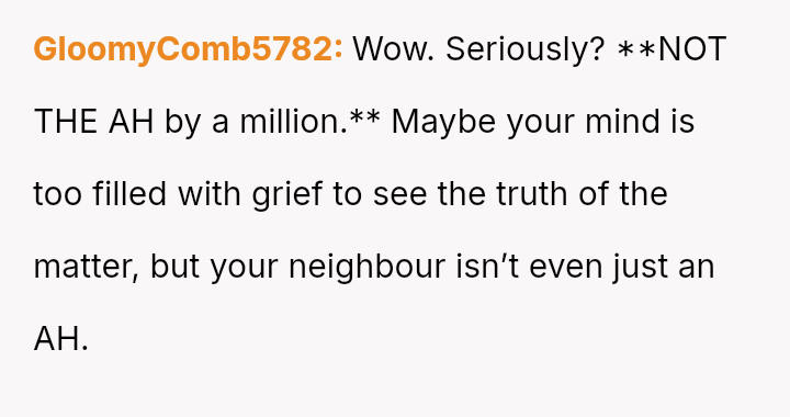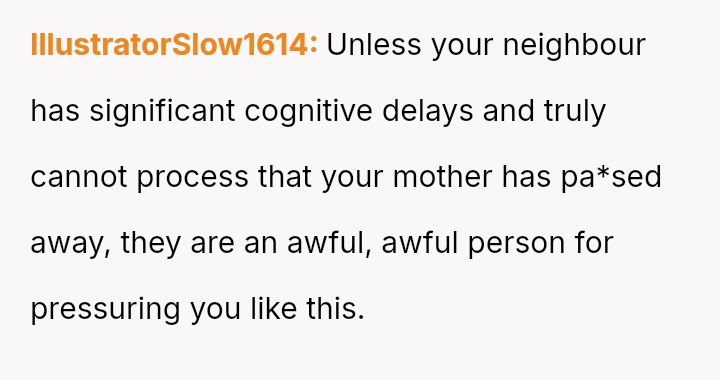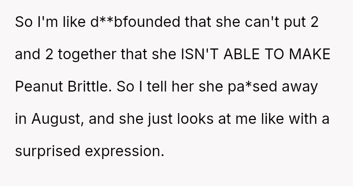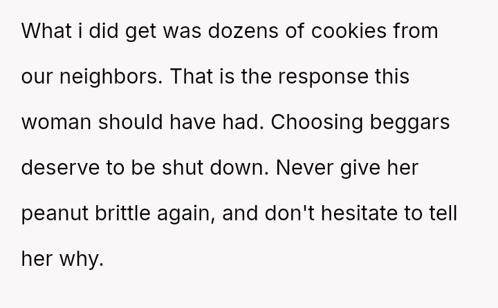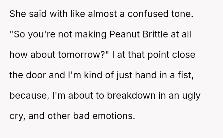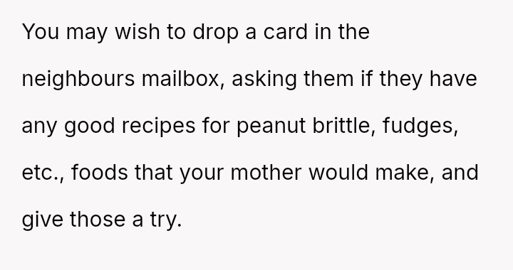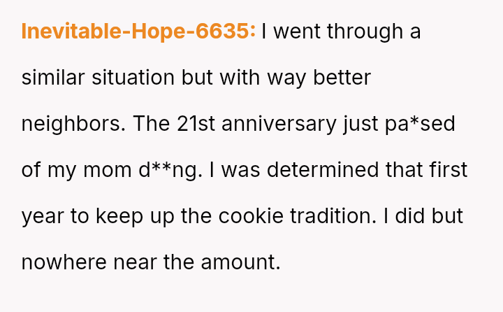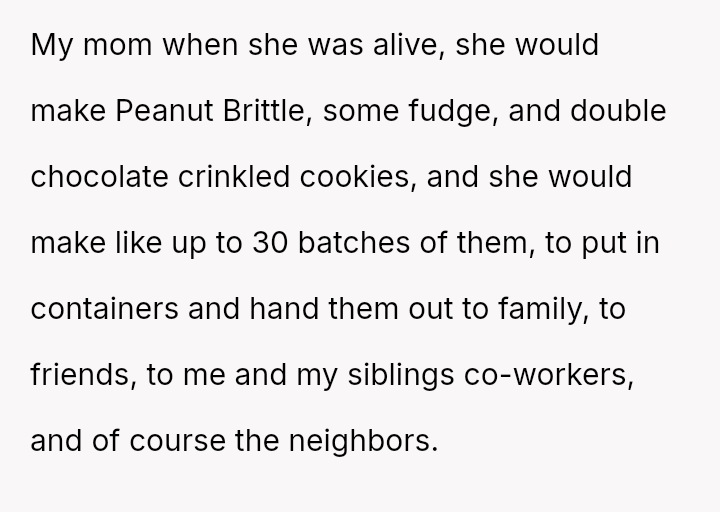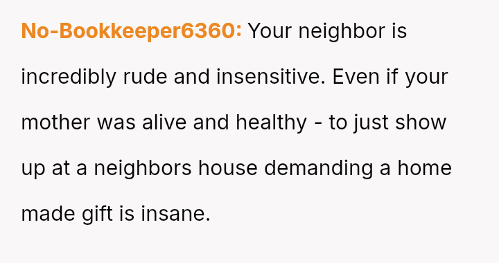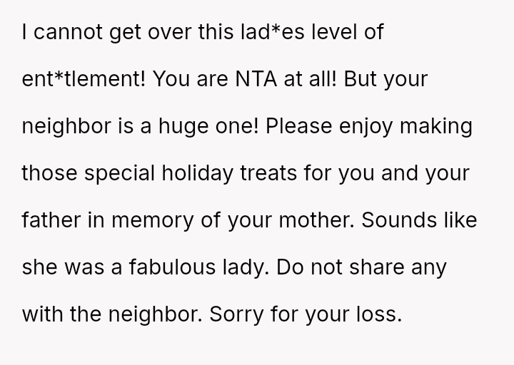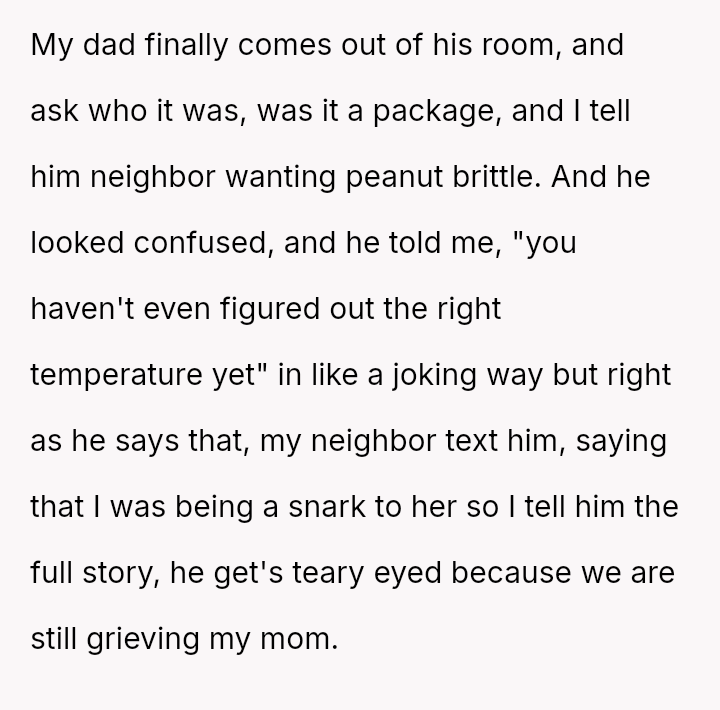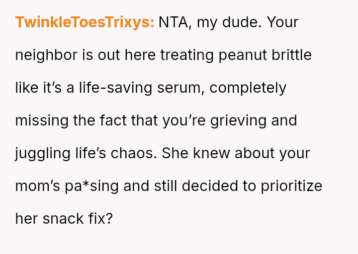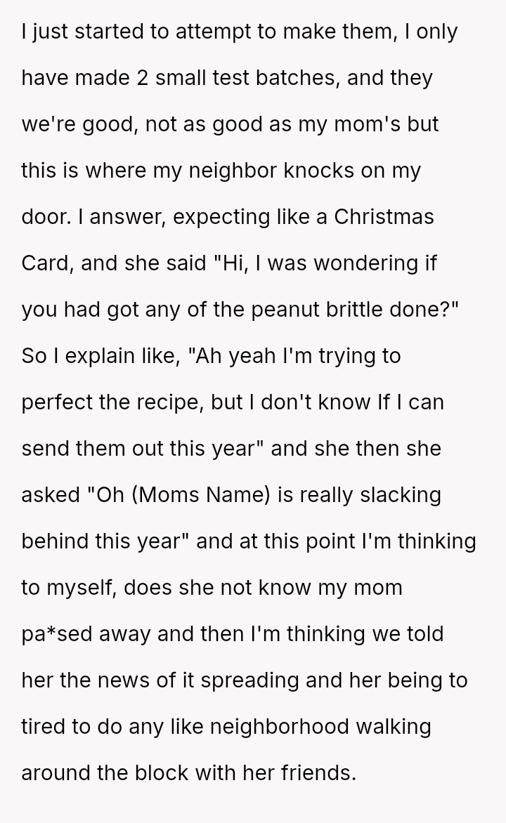 When a neighbor unexpectedly inquired about receiving the traditional peanut brittle, the user reacted poorly after realizing the neighbor seemed unaware or insensitive to the recent death, leading to a tense encounter and subsequent self-doubt about his reaction.
