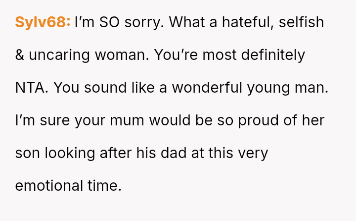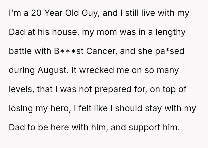 The user, a 20-year-old man, is currently living with his father following the death of his mother in August after a long battle with b***st cancer.