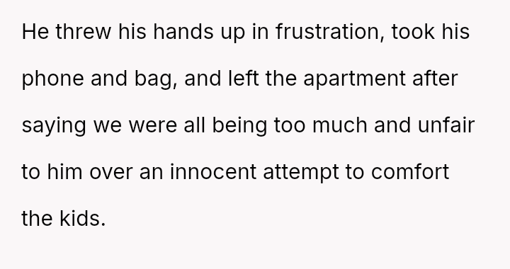 The central conflict lies between the husband's insistence that his actions were an innocent, albeit clumsy, attempt at comfort and the sister's reaction, which prioritized protecting her children from unnecessary trauma.