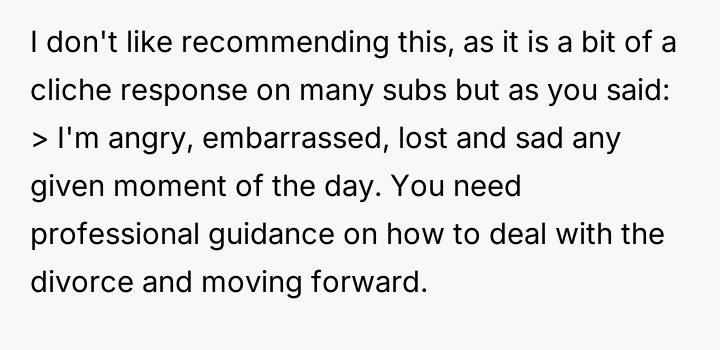 The original poster (OP) is experiencing deep feelings of anger, embarrassment, loss, and sadness following a recent, painful divorce.