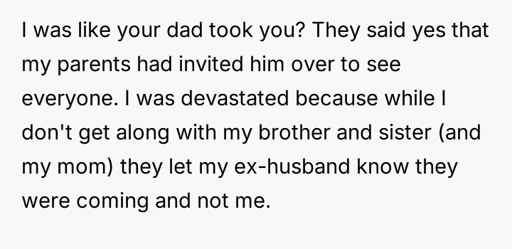 Was the OP justified in sending a furious email to her entire family upon learning they spent time with her ex-husband and his new partner without inviting her, or was her reaction inappropriate given her mother’s claim that the OP’s past behavior makes her unwelcome at family events?