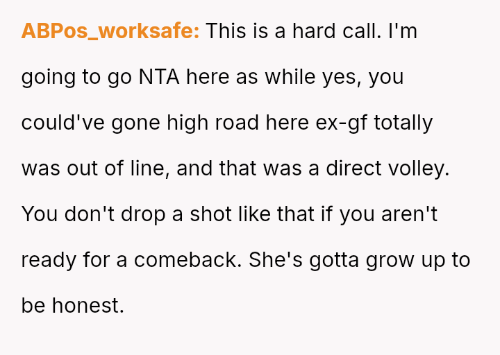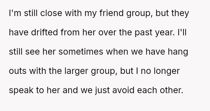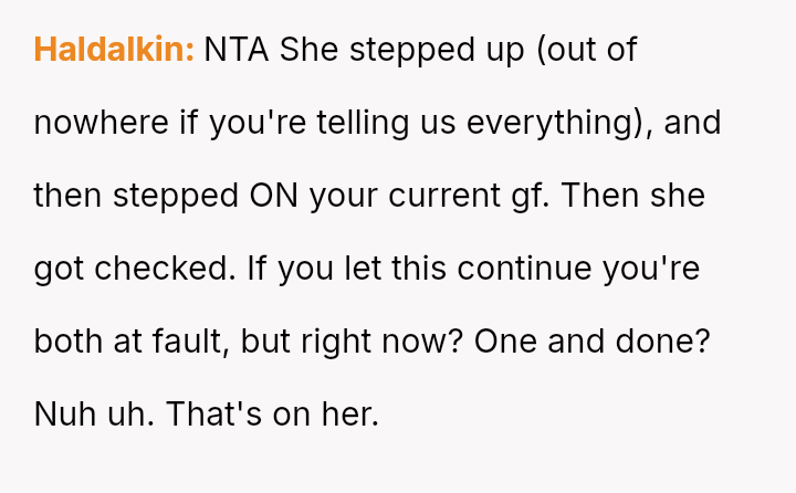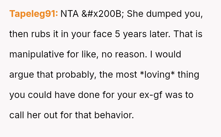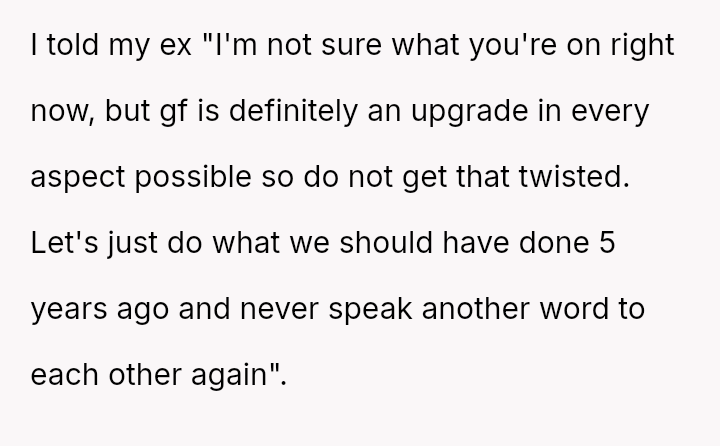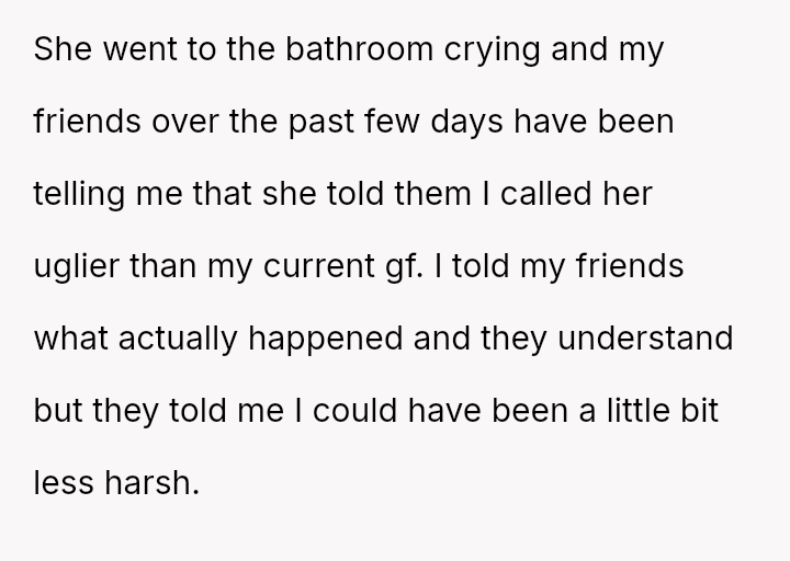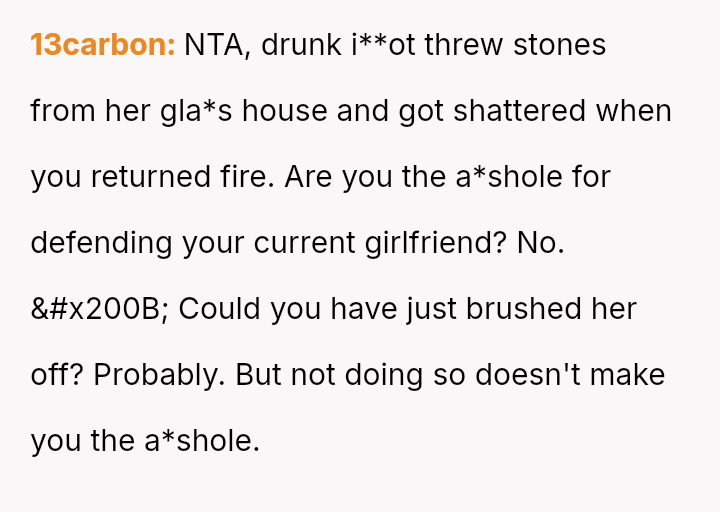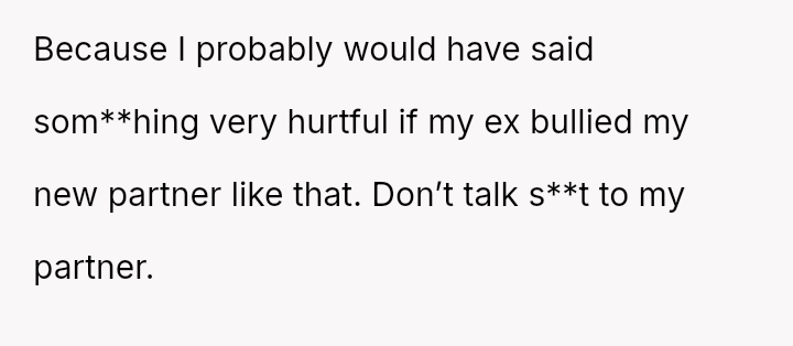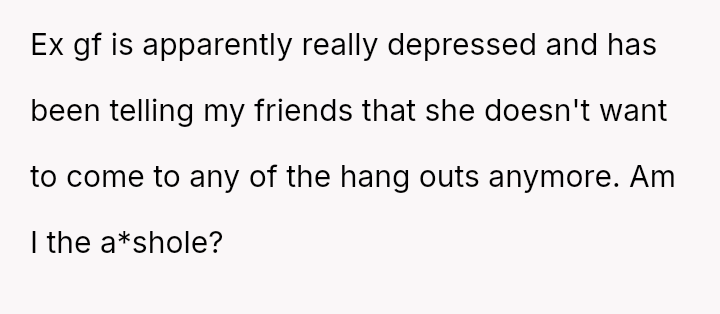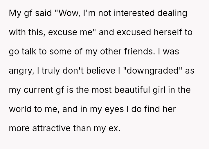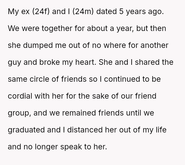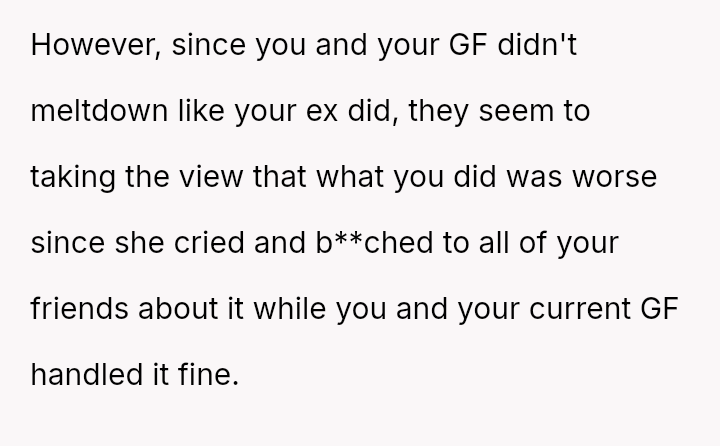 The OP responded strongly, defending his new relationship and severing future contact, which led to the ex-girlfriend becoming distressed and withdrawing from the friend group.