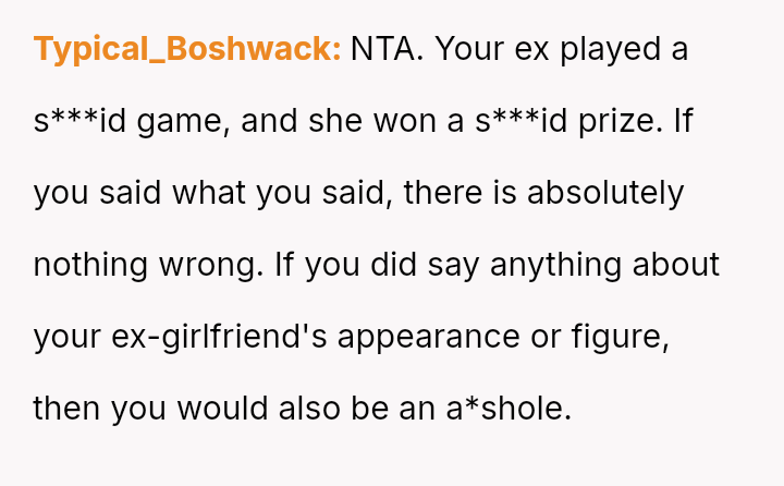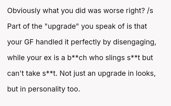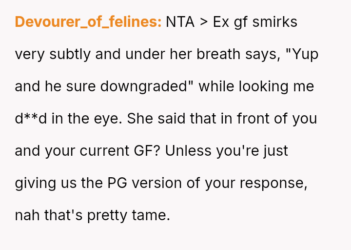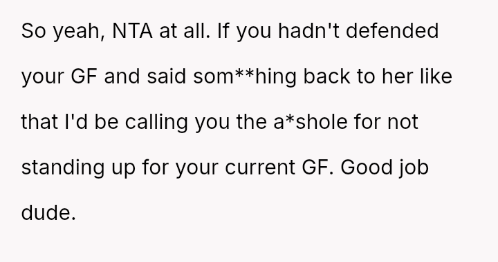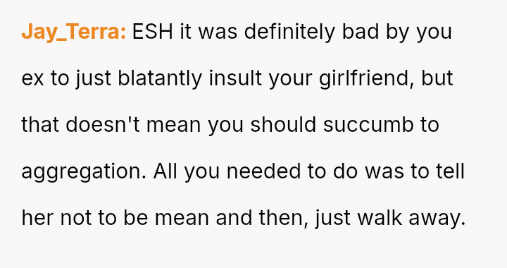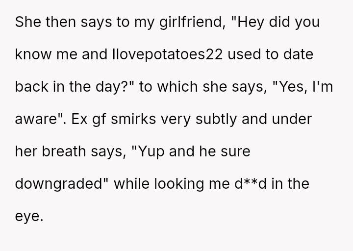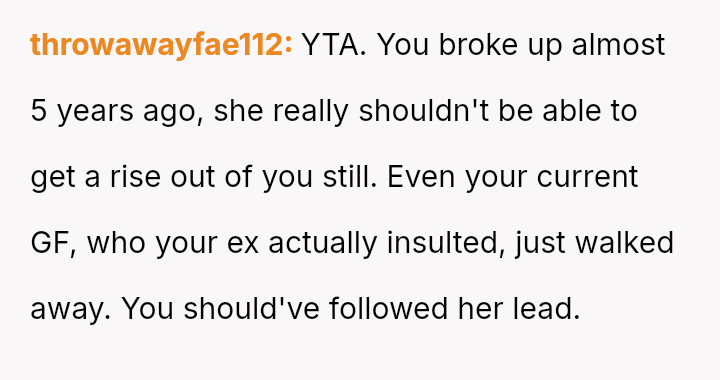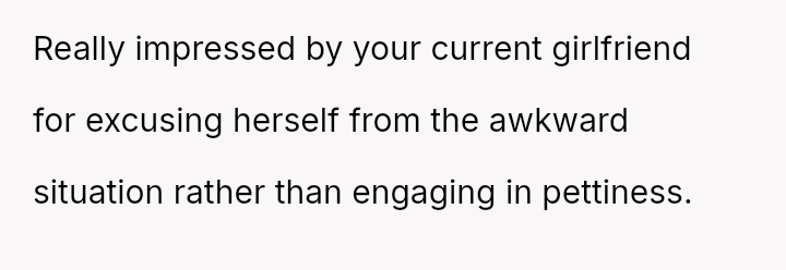 The Original Poster (OP) experienced a difficult situation where his ex-girlfriend made a public, insulting comment about his current partner shortly after an unrelated interaction.