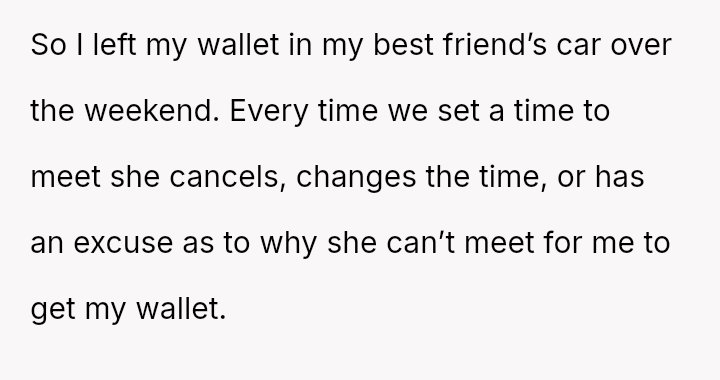 The original poster (OP) experienced significant frustration and mistrust due to their best friend's repeated cancellations and excuses preventing the return of a lost wallet.