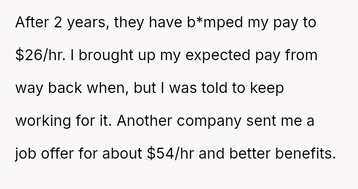 The original poster (OP) felt undervalued by their employer for two years despite consistently exceeding expectations and communicating their desired salary, which had since risen above their starting agreement.