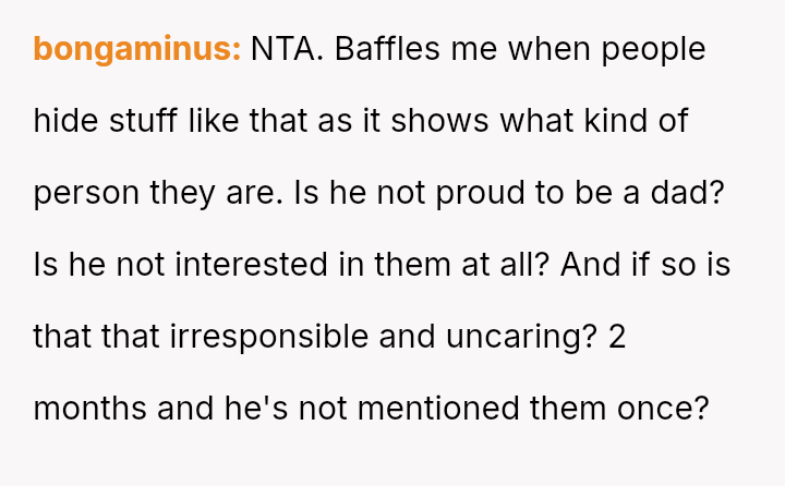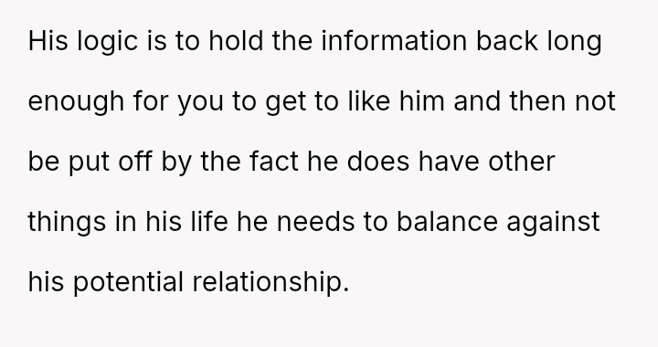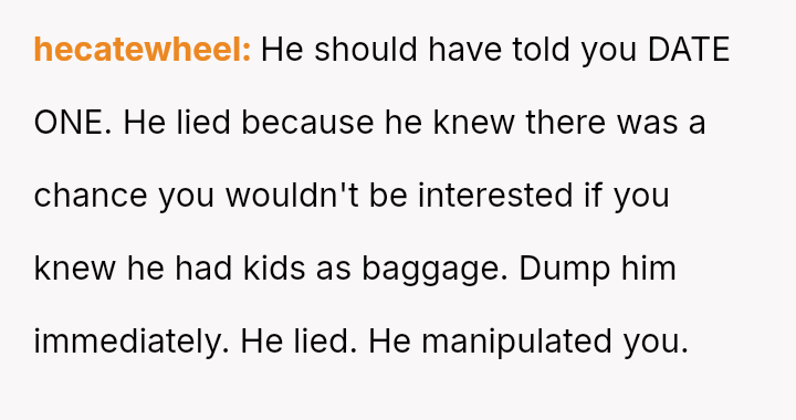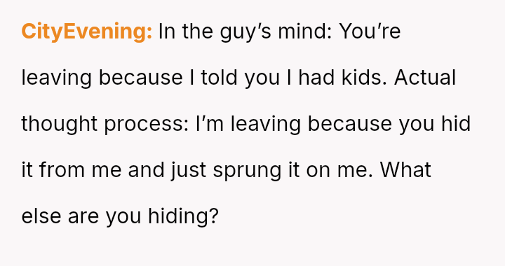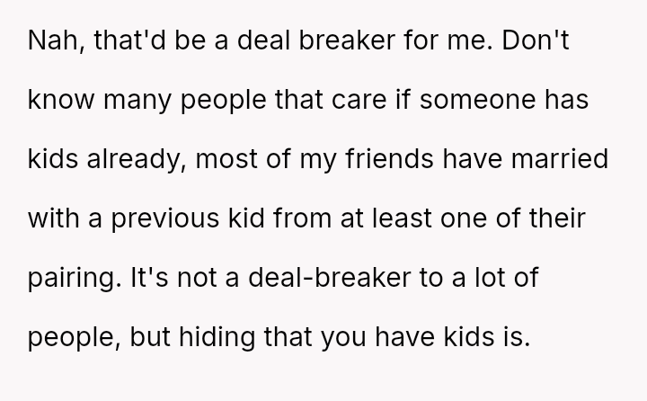 Given the magnitude of this undisclosed fact, the central question remains: Is the man's decision to hide his parental status due to fear of rejection, or is this behavior evidence of a fundamental trustworthiness issue that warrants immediate termination of the relationship?