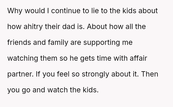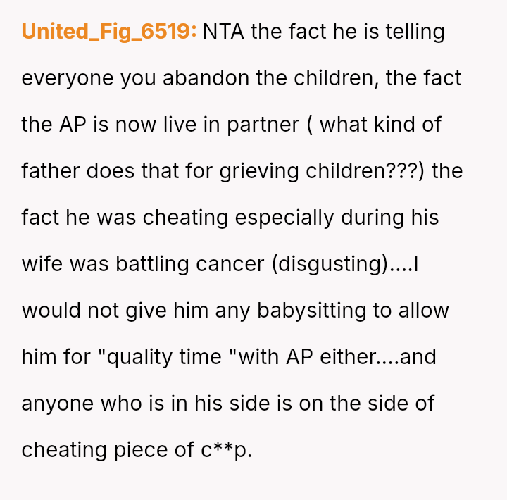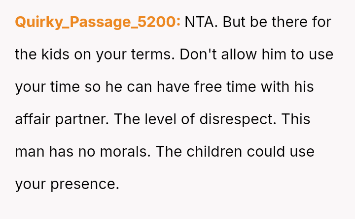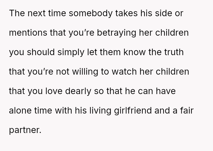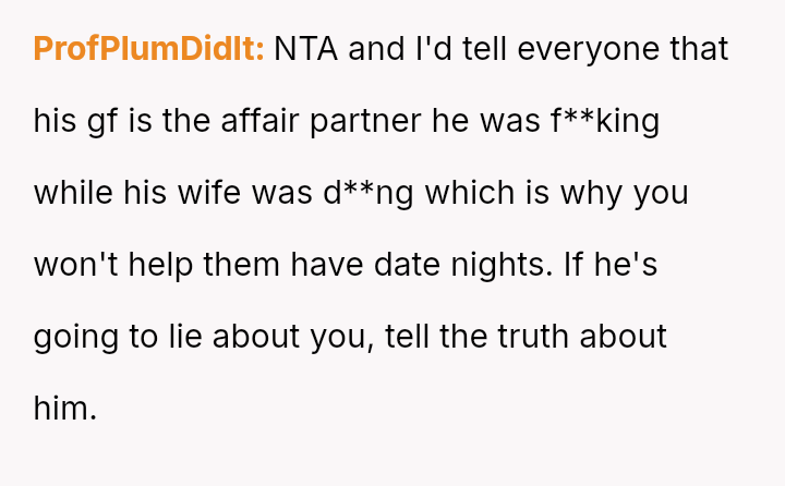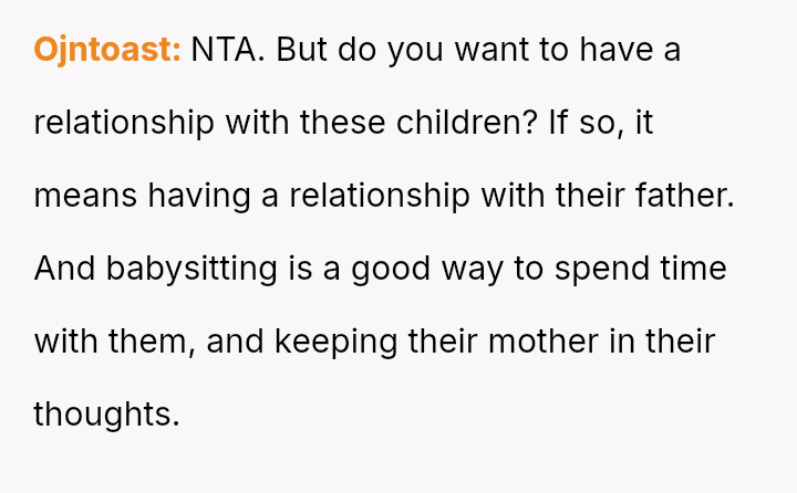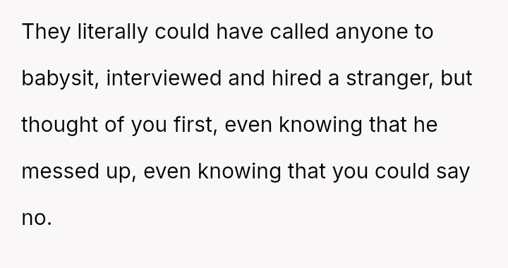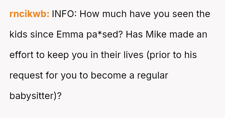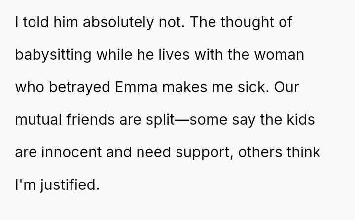 Recently, Mike contacted the OP asking her to regularly babysit for him and his new live-in girlfriend—the same woman he had the affair with—claiming it was what Emma would have wanted.