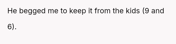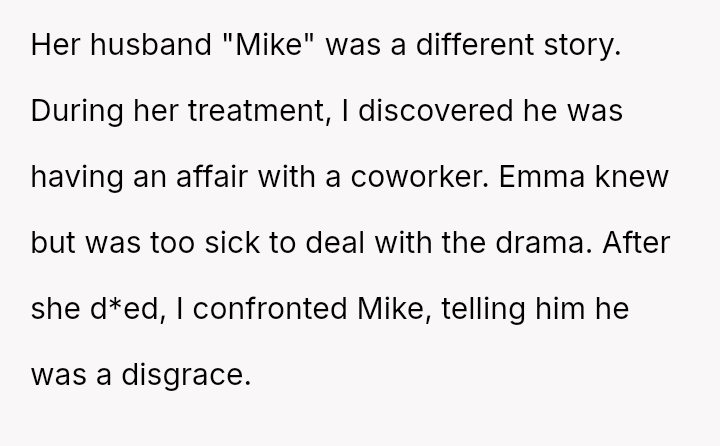 During the treatment period, the OP discovered that Emma's husband, "Mike," was having an affair. Following Emma's death, the OP confronted Mike about his in***elity, who then pleaded for silence regarding the children (ages 9 and 6).