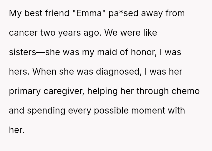 The original poster (OP) details a deeply personal situation involving the death of her best friend, "Emma," two years prior due to cancer. The OP served as Emma's primary caregiver during her illness, indicating a very close bond.