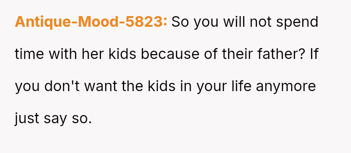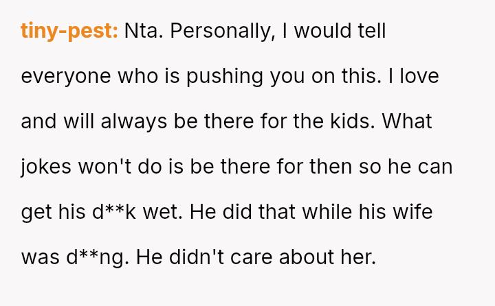 The OP refused, feeling disgusted by the request, which has led to social friction, with mutual friends and the OP's family pressuring her, suggesting she is being vindictive by withholding support from the children.