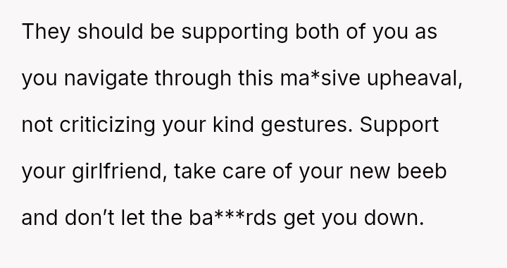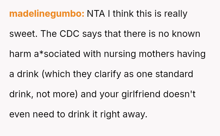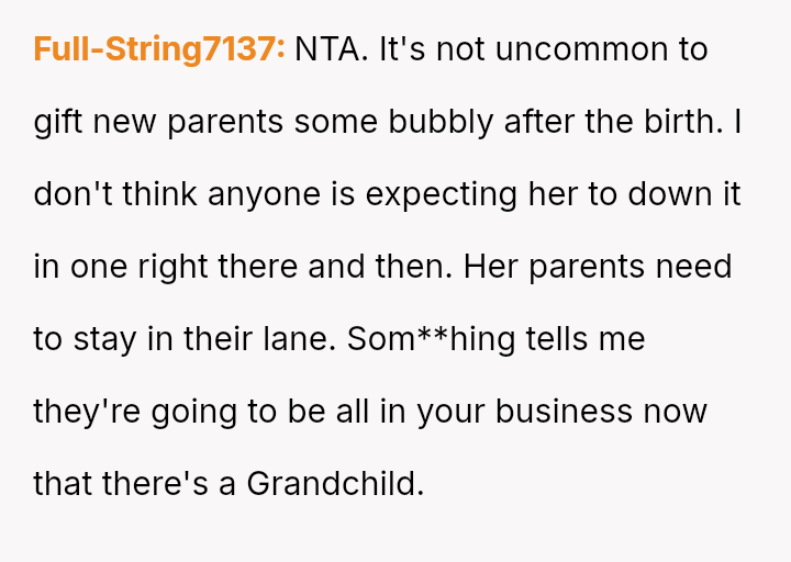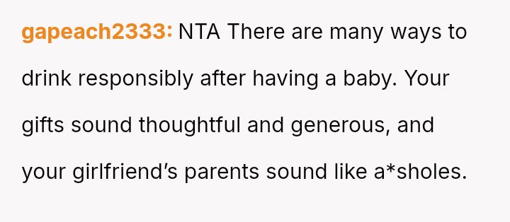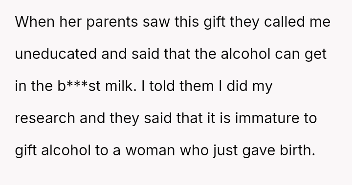 However, this action directly conflicted with the strong disapproval and judgment from the girlfriend's parents regarding the appropriateness of gifting alcohol to a new mother, creating tension around his perceived lack of understanding or care for postpartum health and social norms.