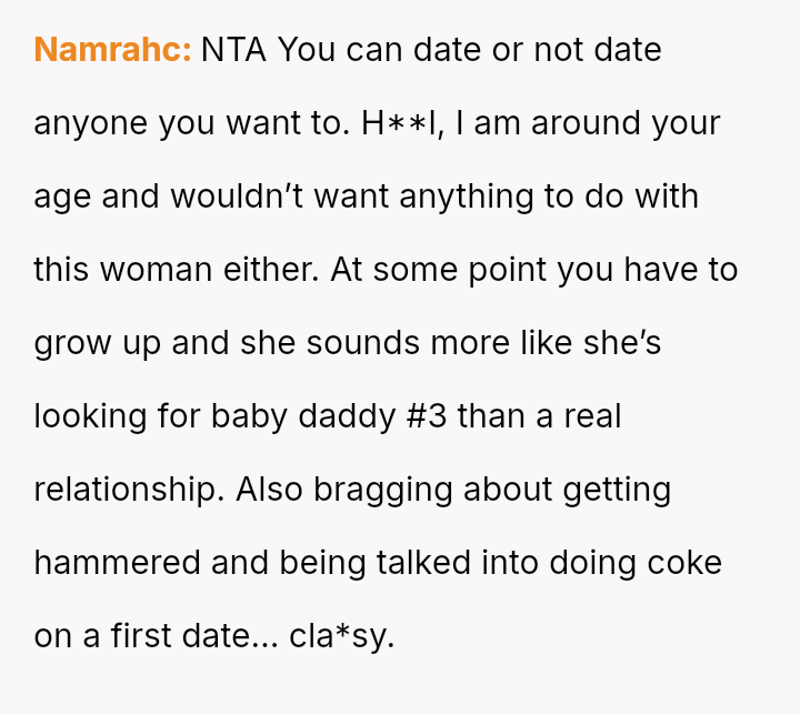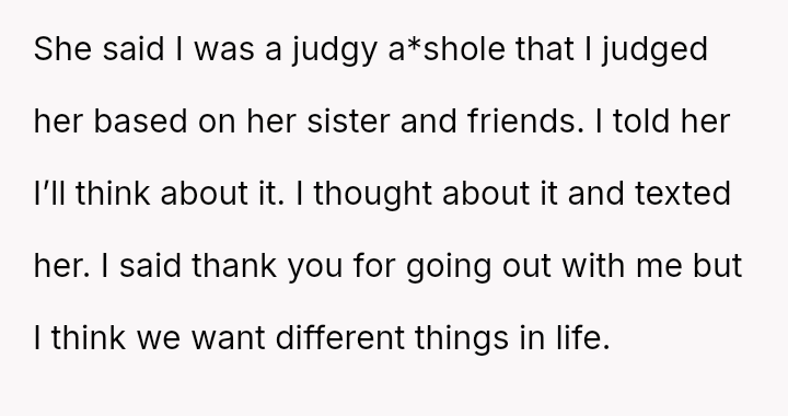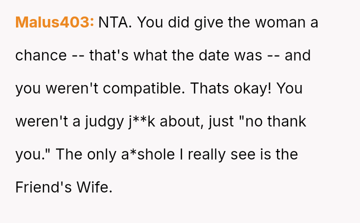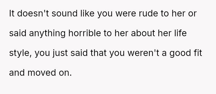 Was the OP justified in immediately rejecting the date based on her revealed lifestyle and values, or should he have honored the setup by giving her a second chance as his friend's wife suggested, even if he felt uncomfortable?