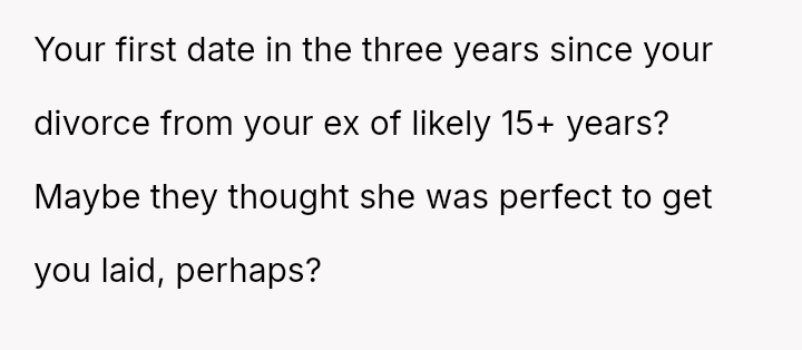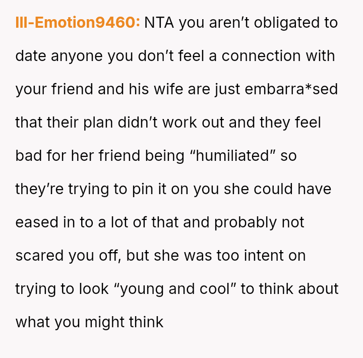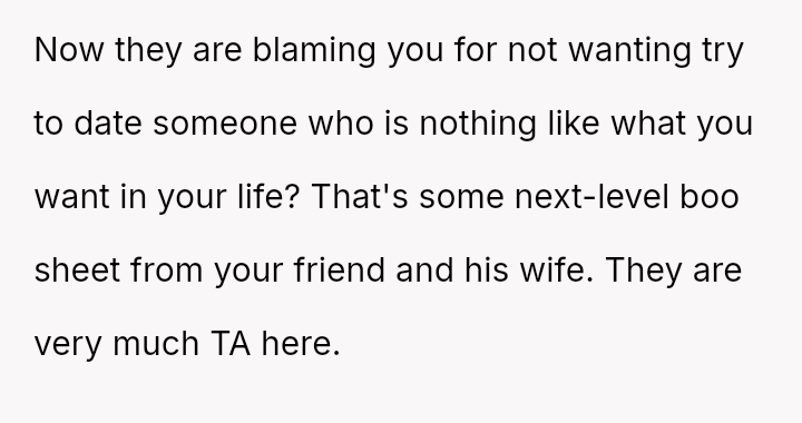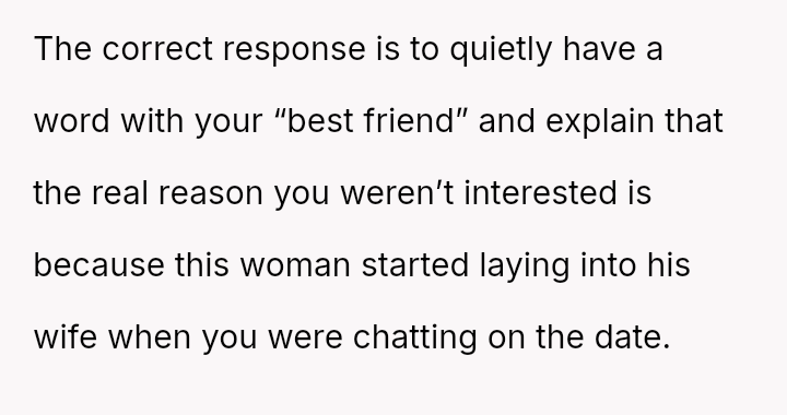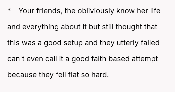 The original poster (OP) faced a difficult situation where a well-intentioned setup by his best friend's wife resulted in a significant mismatch in lifestyle and values with the date.