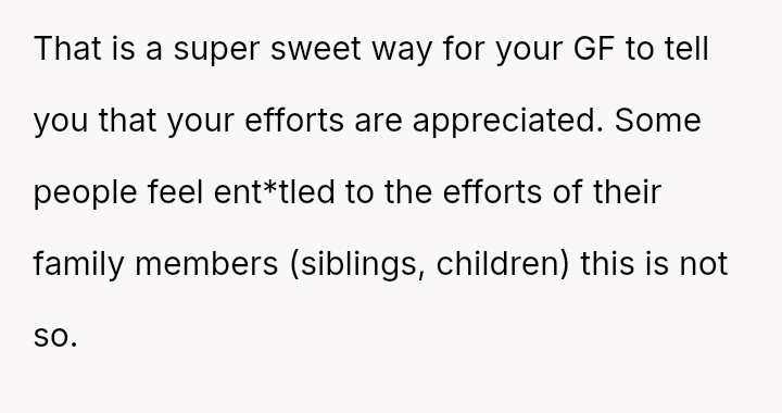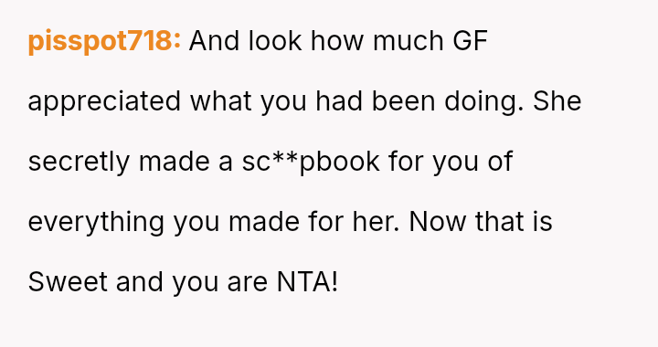The original poster experienced deep appreciation for a thoughtful, time-intensive gift from his girlfriend, which was centered around his personal hobby.