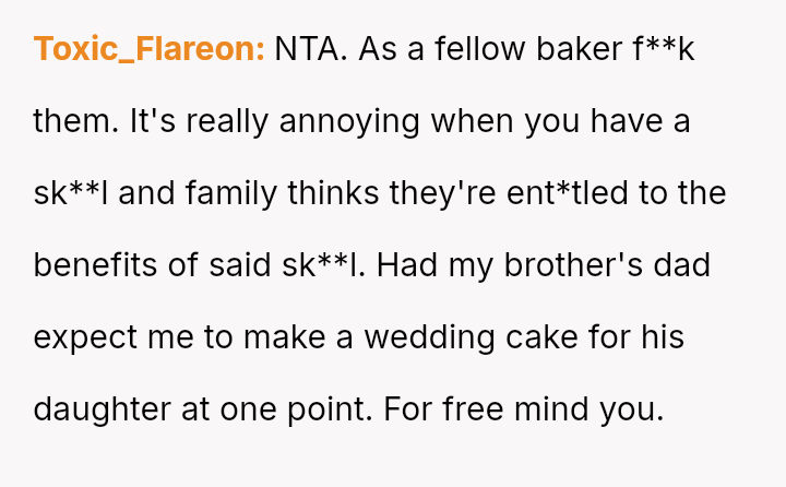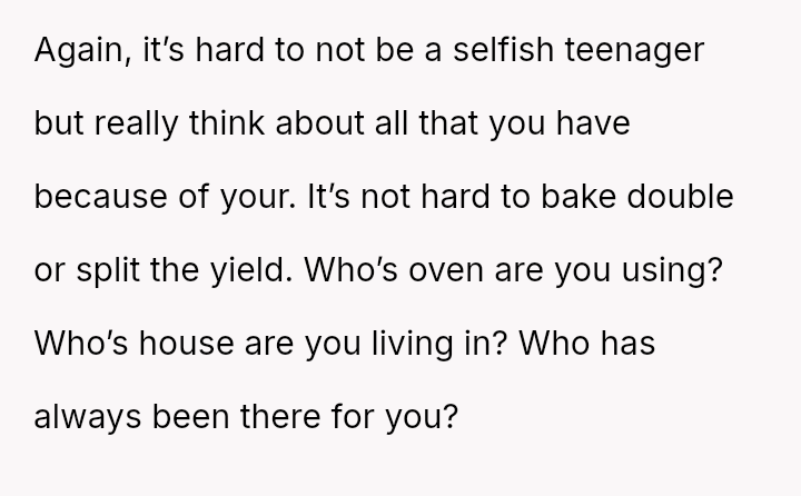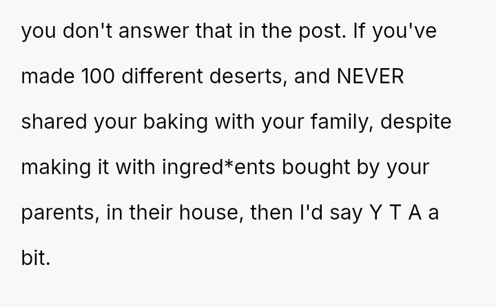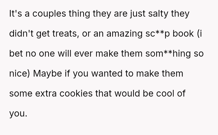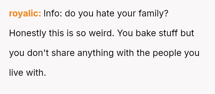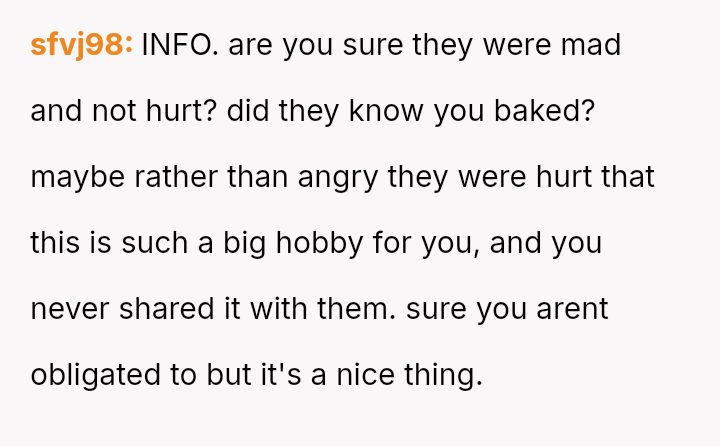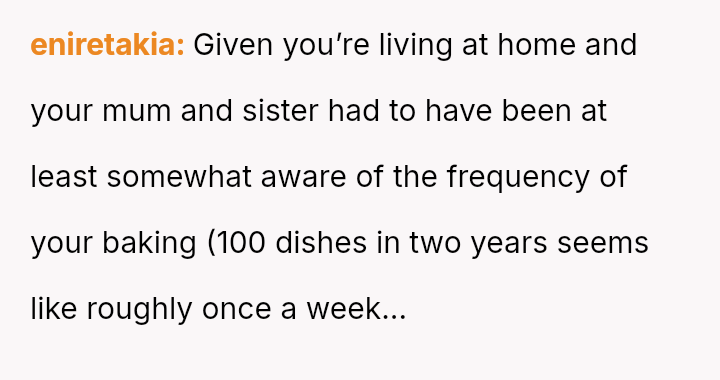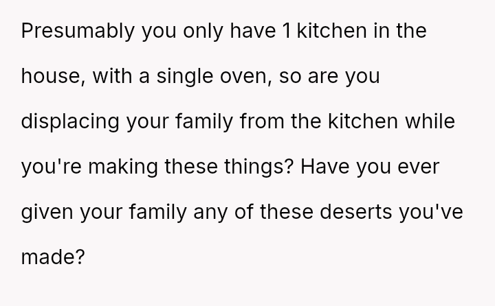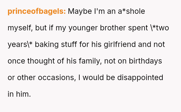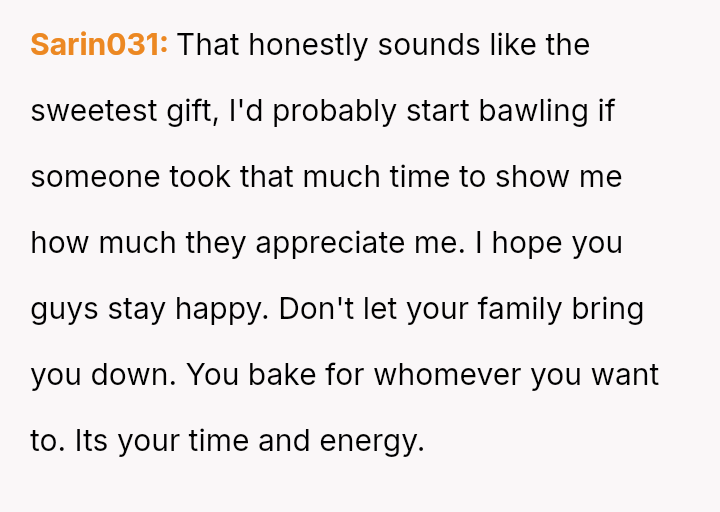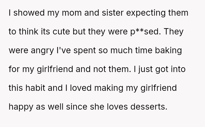 However, this expression of affection created immediate conflict with his mother and sister, who felt overlooked and unappreciated because the OP dedicated significant time and effort to baking solely for his partner.