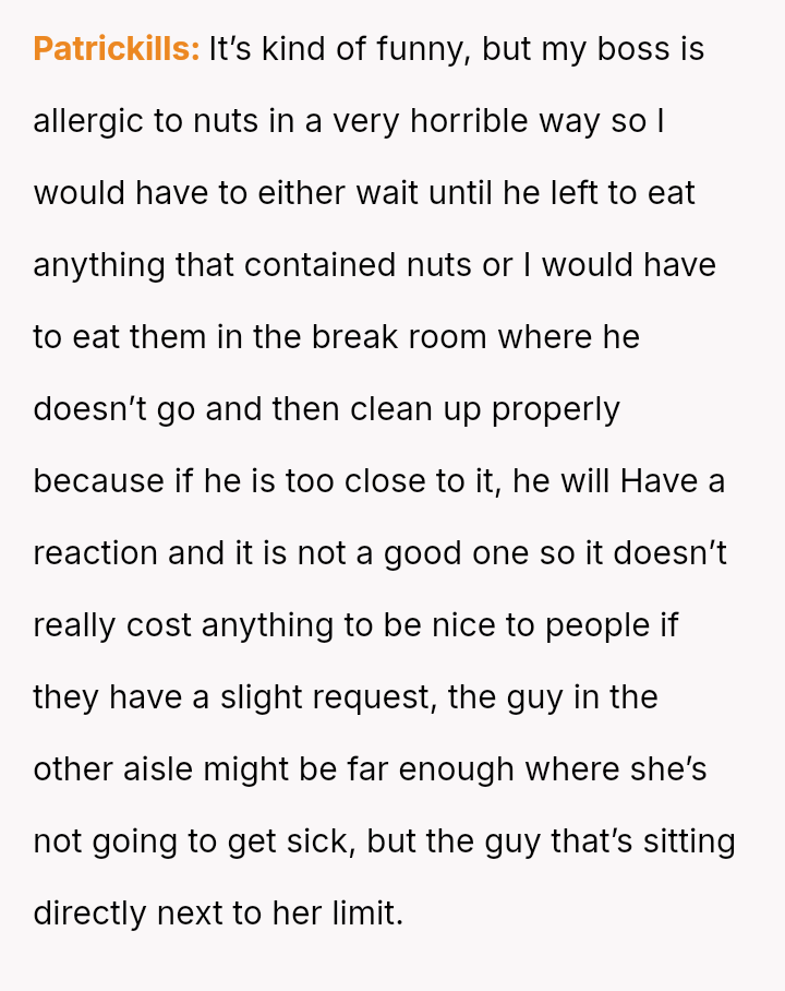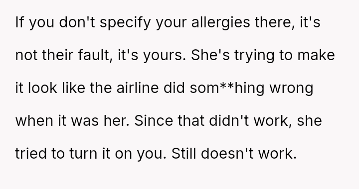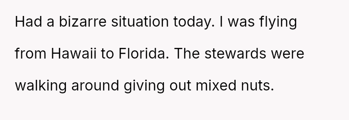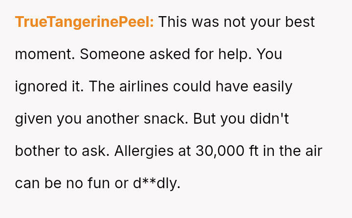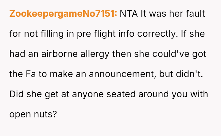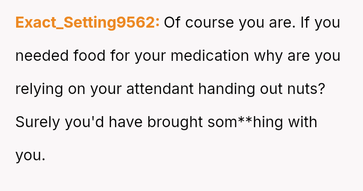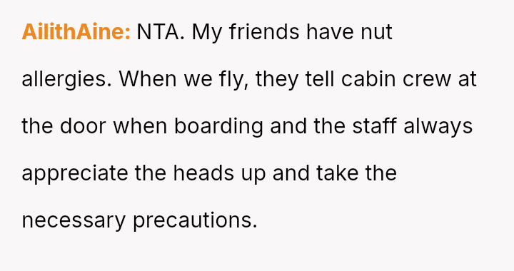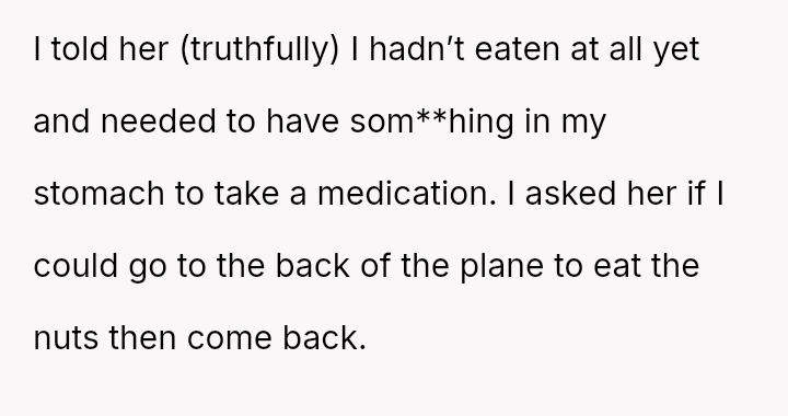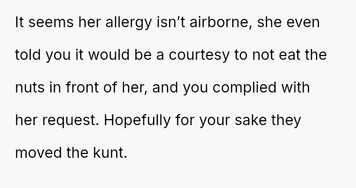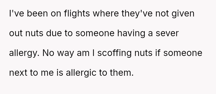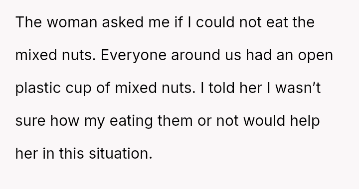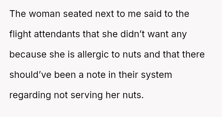 As flight attendants distributed mixed nuts, the woman seated next to the original poster (OP) immediately informed them she had a nut allergy.