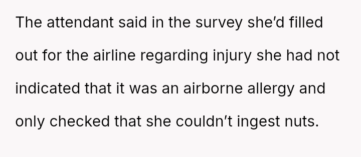 The flight attendant noted that the woman's allergy information in the system specified ingestion issues, not airborne risk, leading to a brief disagreement over the specificity required for notification.