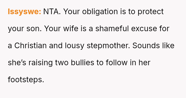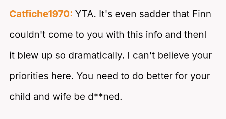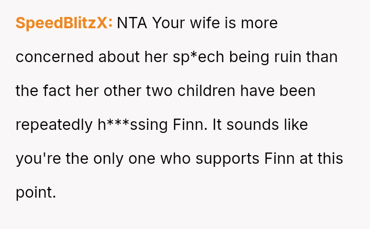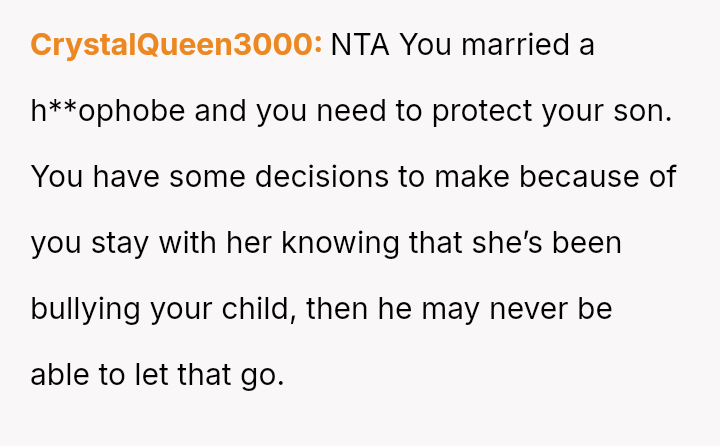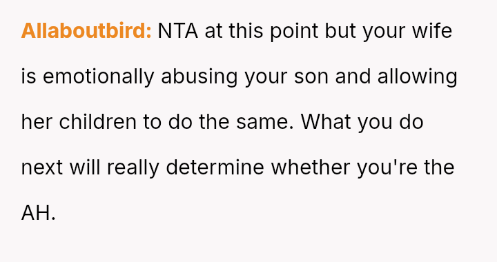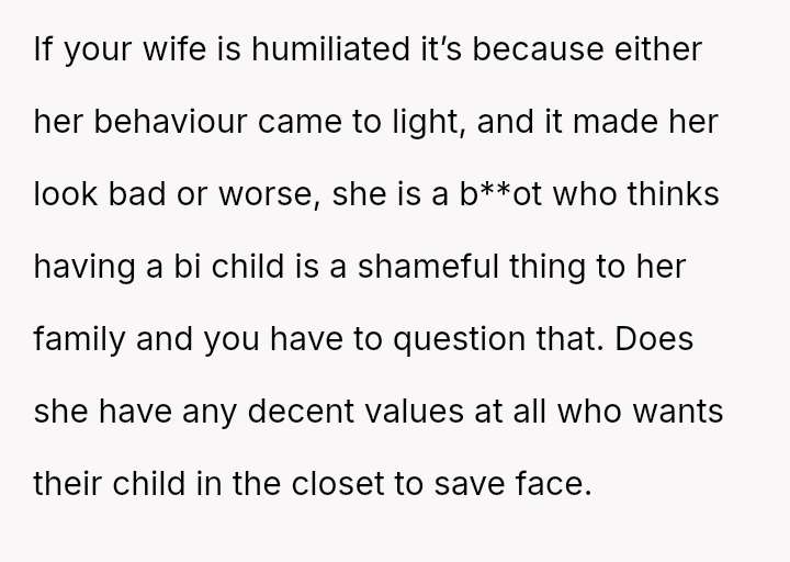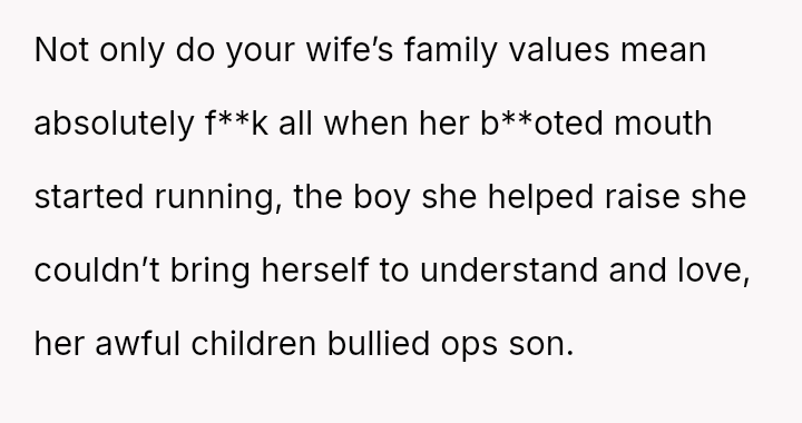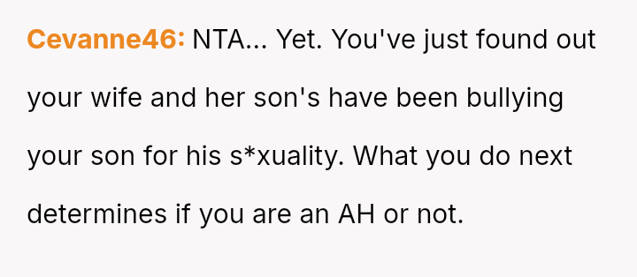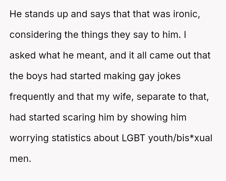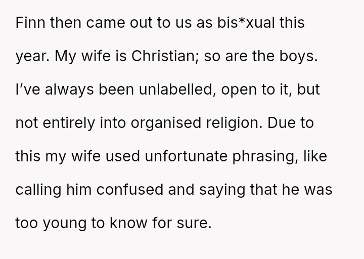 The original poster (OP) is facing a significant conflict between supporting their bis*xual son, Finn, and managing the reactions of their wife and stepsons, who have engaged in hurtful behavior following Finn's coming out.
