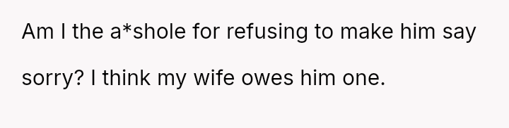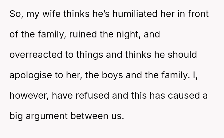 The central conflict lies in the OP's refusal to force Finn to apologize for exposing the negative actions of the wife and stepsons, actions which the wife views as an embarra*sment that ruined a family event.