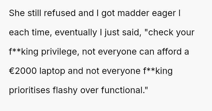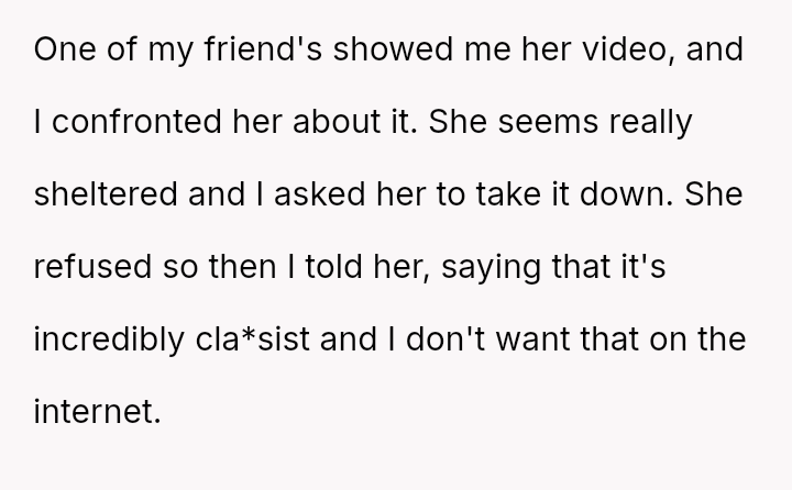 The conflict escalated when the OP confronted the cla*smate, who refused to remove the video, leading to an angry outburst from the OP regarding cla*s privilege.