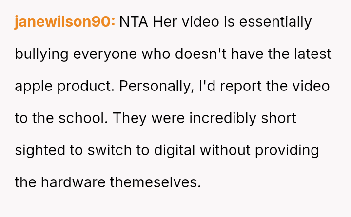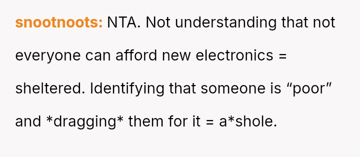 The original poster (OP) feels hurt and publicly humiliated by a cla*smate who mocked their financial status and old technology in a widely shared video.
