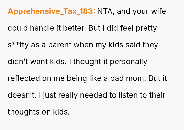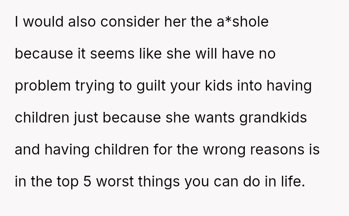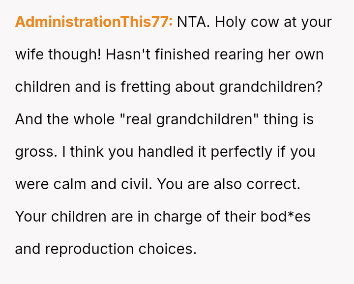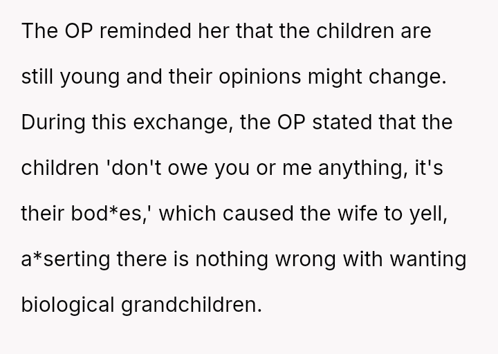 The original poster (OP) found himself in a conflict with his wife after affirming his children's autonomy regarding parenthood, stating they do not owe their parents grandchildren.