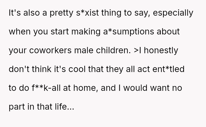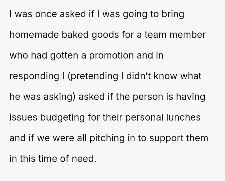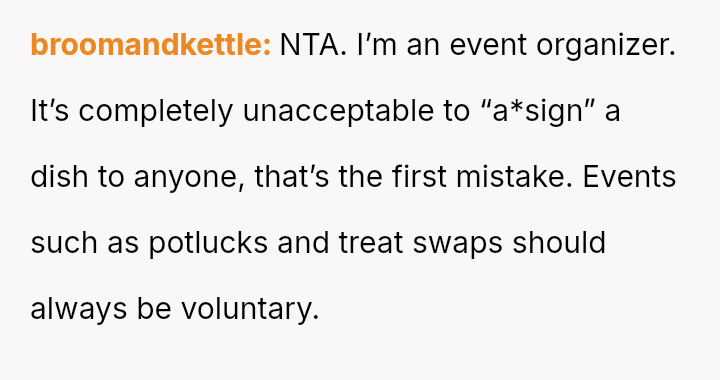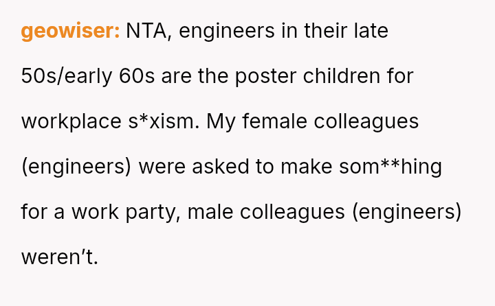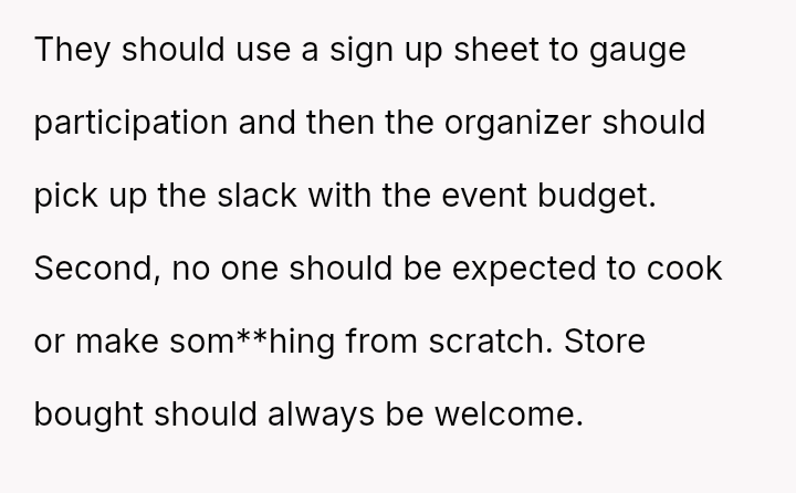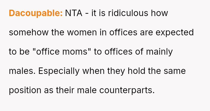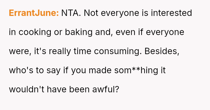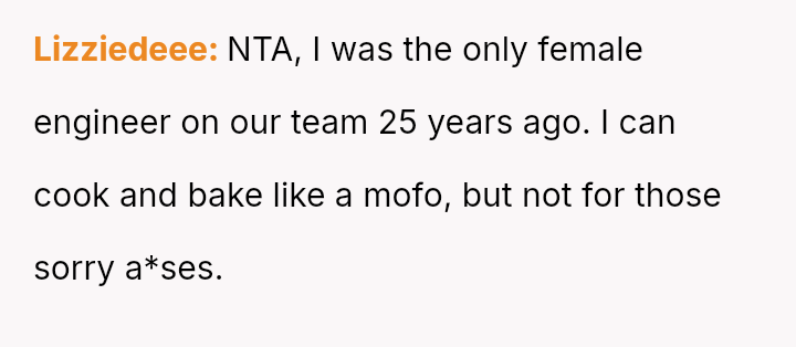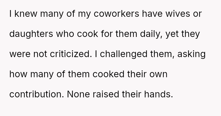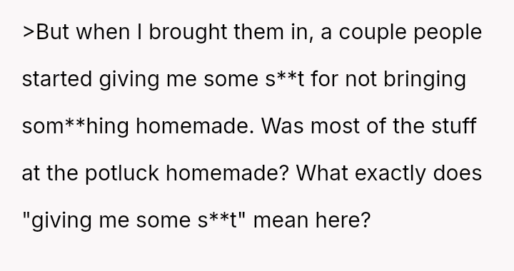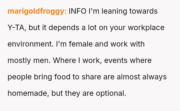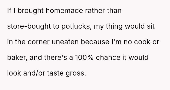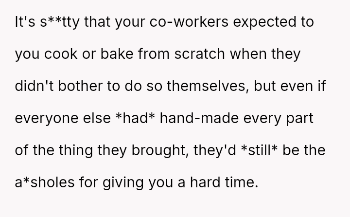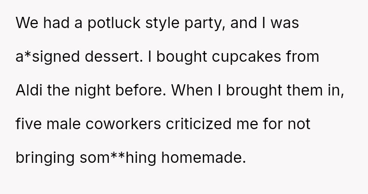 The original poster (OP) faced criticism from male coworkers for bringing store-bought cupcakes to a work potluck, an expectation that seemed unevenly applied given that many male colleagues relied on family members for their contributions.