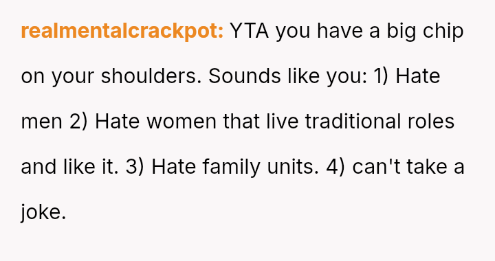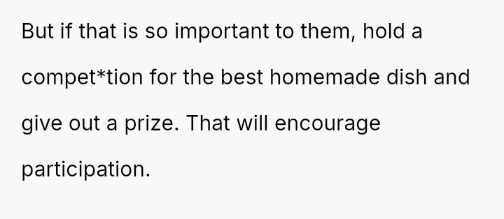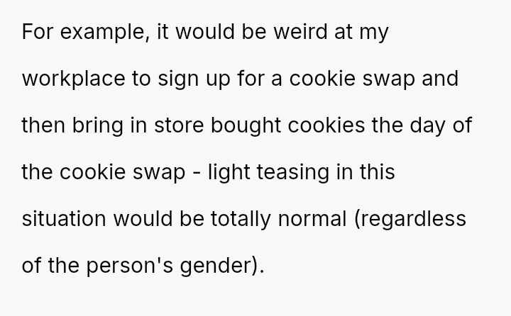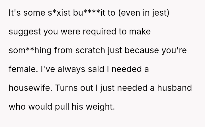 Does the pressure on women to provide 'homemade' effort in social settings justify a strong pushback, even if the m**hod of pushback causes friction?