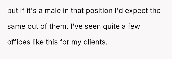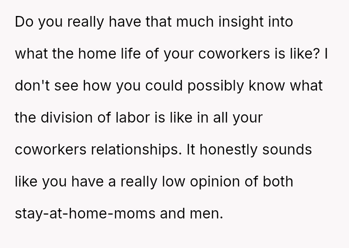 Confronted by the unspoken biases of her coworkers, who comfortably rely on the efforts of the women in their lives, she courageously challenges the double standard that dismisses her efforts while excusing their own.