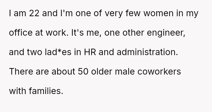 In a sea of predo****ntly male colleagues, a young woman stands quietly, her presence a rare beacon of diversity in an overwhelmingly traditional workspace.
